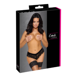 Black lace thong with velvety waistband and silver-coloured metal chain over the crotch for secretive erotic pleasures.