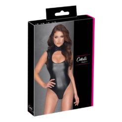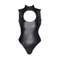 Black matte look bodysuit with front cutout and high collar with hook fastener at the front. Press studs in the crotch area.