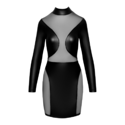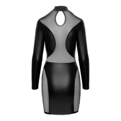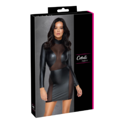 Black tight-fitting matte look mini dress with sheer mesh inserts and long sleeves. Stand-up collar with button closure.