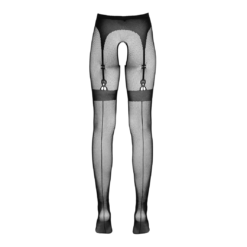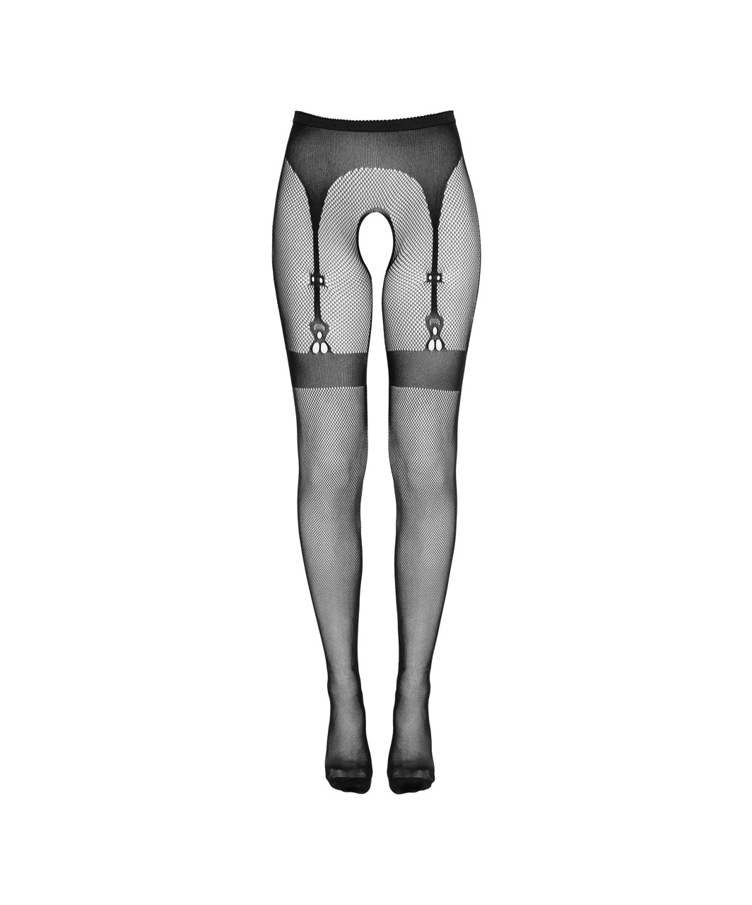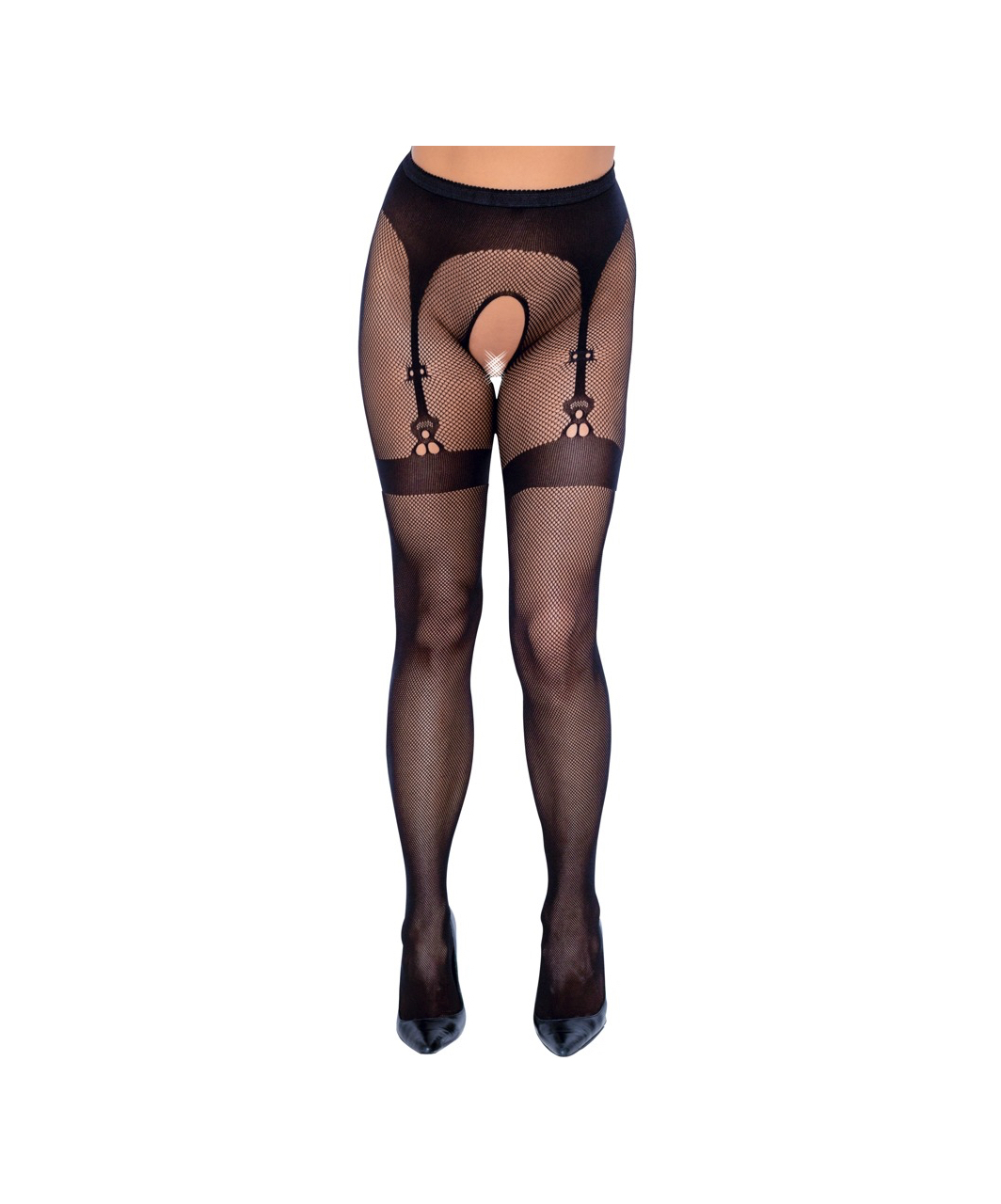 Black net crotchless tights with garter belt and stocking pattern. Reinforced toe. Unisize (S–L).