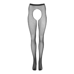 Black net crotchless tights with cutouts, covered in rhinestones that are in various sizes. Reinforced toe. Unisize (S–L).