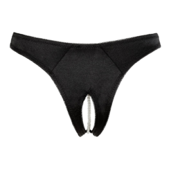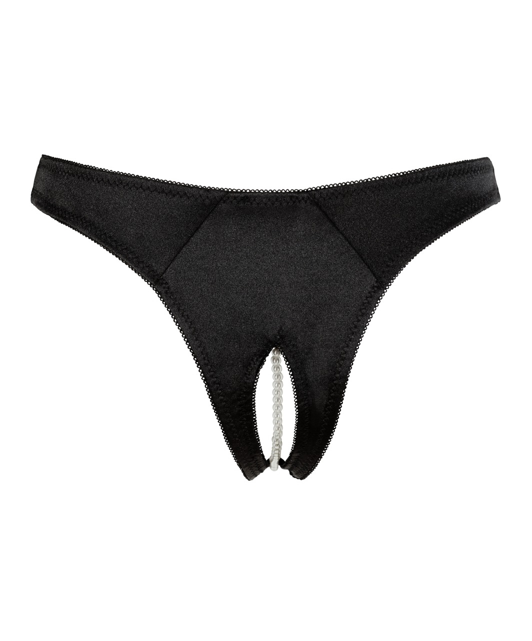 Black crotchless G-string made of glossy satin with delicate guipure lace at the front and string of white pearls that will provide you with titillating feelings.