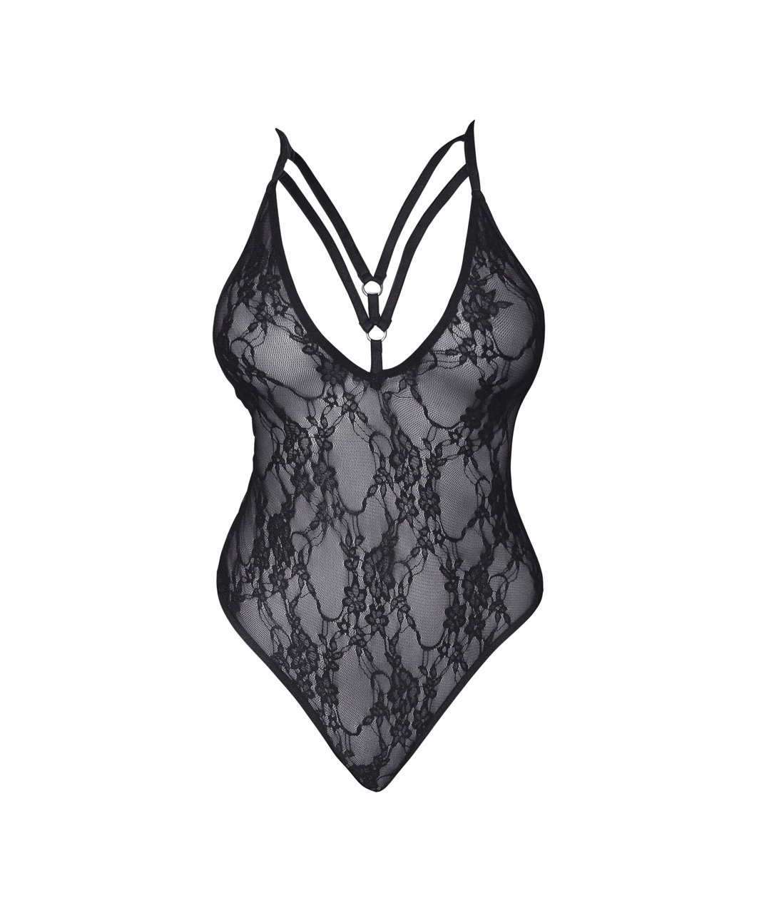 Black bodysuit made of sheer mesh with floral lace pattern. Straps are adjustable.
