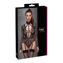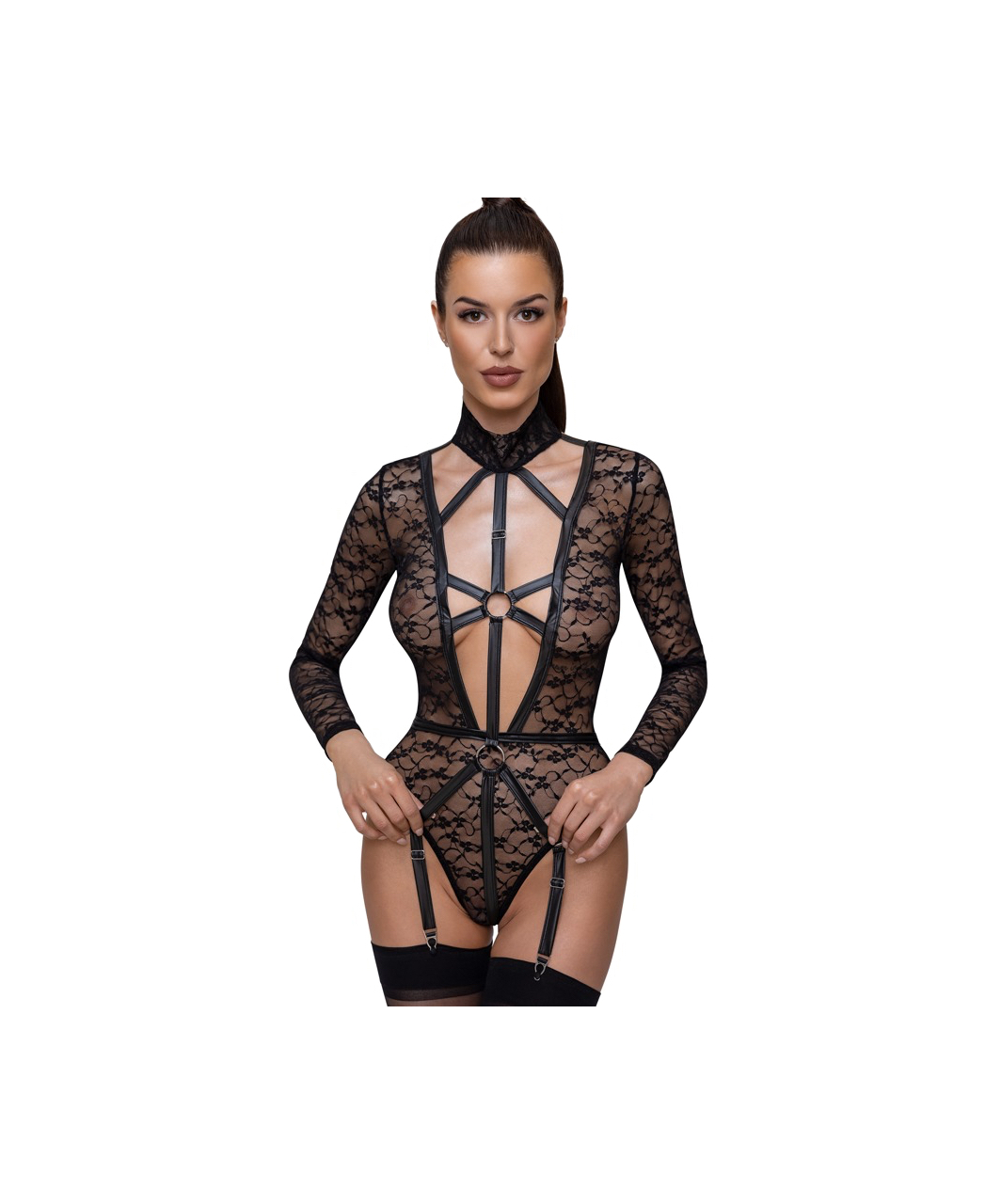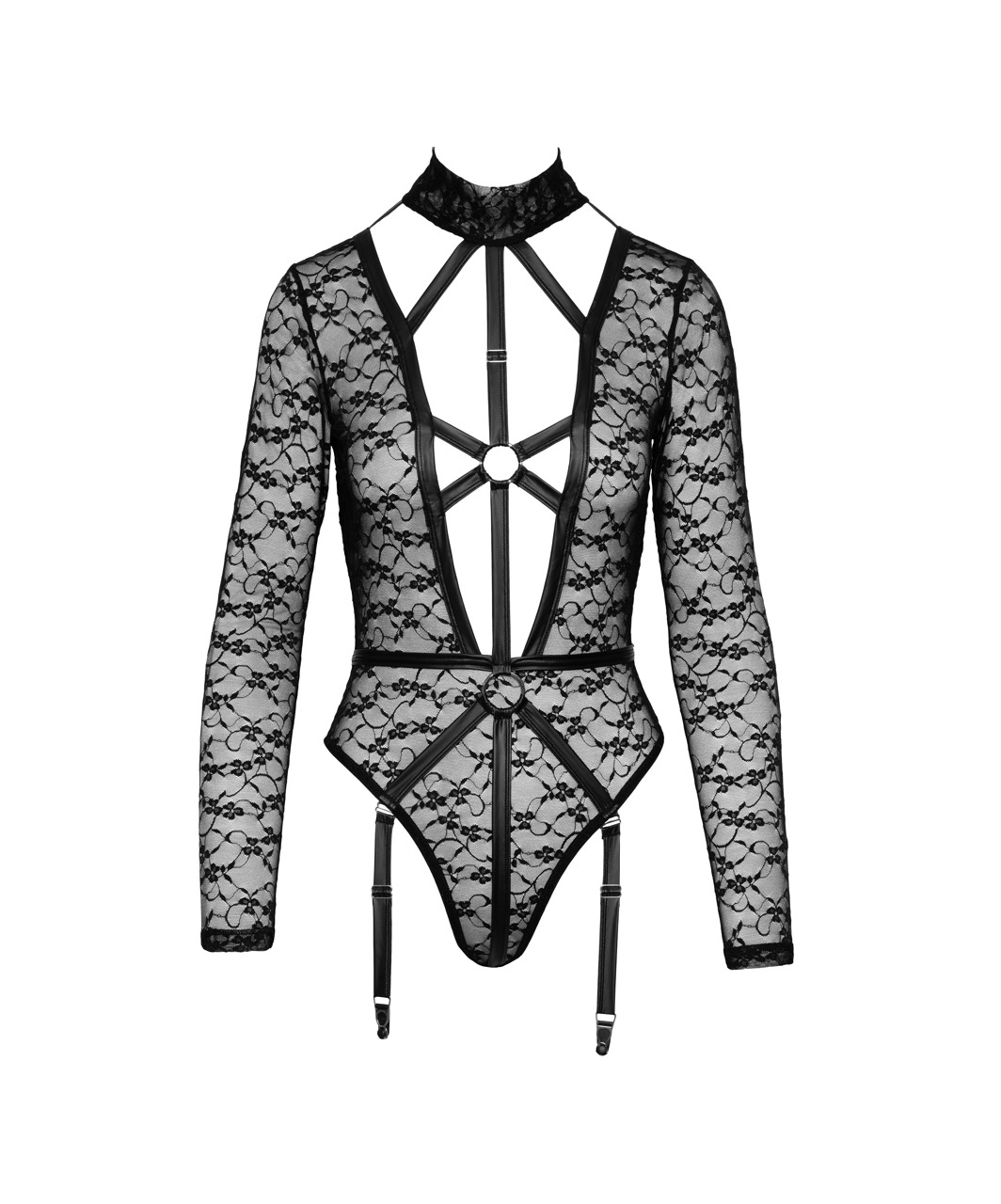 Black sheer patterned mesh bodysuit in a matte look mock harness design with low-cut front & back. Suspenders are adjustable and detachable. Press stud closure over the crotch. The collar with button back closure.