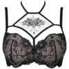 Slightly padded half bra with adjustable straps and hook and eye closure. Black with delicate embroidery.