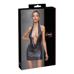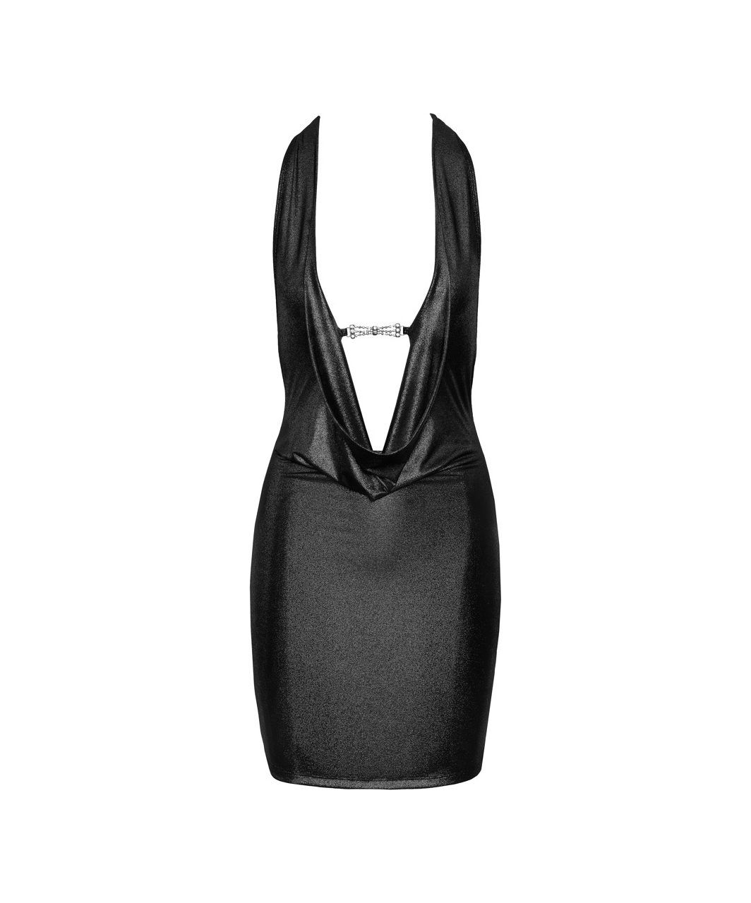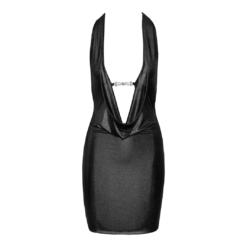 Black open back halterneck mini dress made of shimmering fabric. The plunging cowl neckline is adorned with a rhinestone clip.