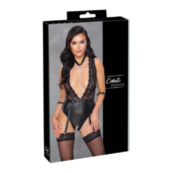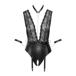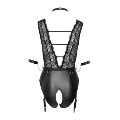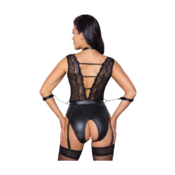 Black low-cut open back suspender bodysuit with a top made of delicate floral lace and a crotchless briefs made of matte look fabric. The back has a plunging V-neckline with stretchy ladder straps. The suspenders are attached to the rings on the belt. The collar and the belt connected with a snap hook chain. The ring at either side of the body can be used to attach the included arm restraints with snap hook chains. The belt and the suspender straps are adjustable; can also be removed completely. The restraints has hook and loop fasteners. The collar has press stud closure.
