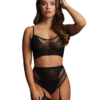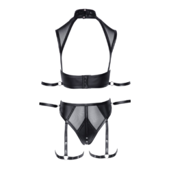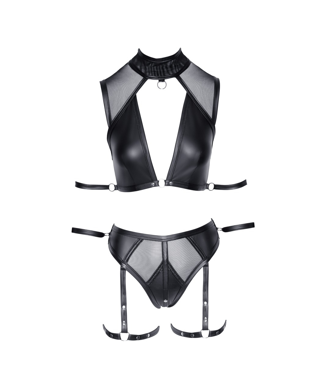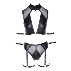 Black matte look crop top with sheer mesh inserts and a high collar. Adjustable hook fastener at the back. Matching panties with press studs over the crotch and detachable garters. Both crop top and panties has a handcuffs attached to the side rings with a hook and loop fastener.