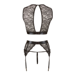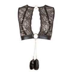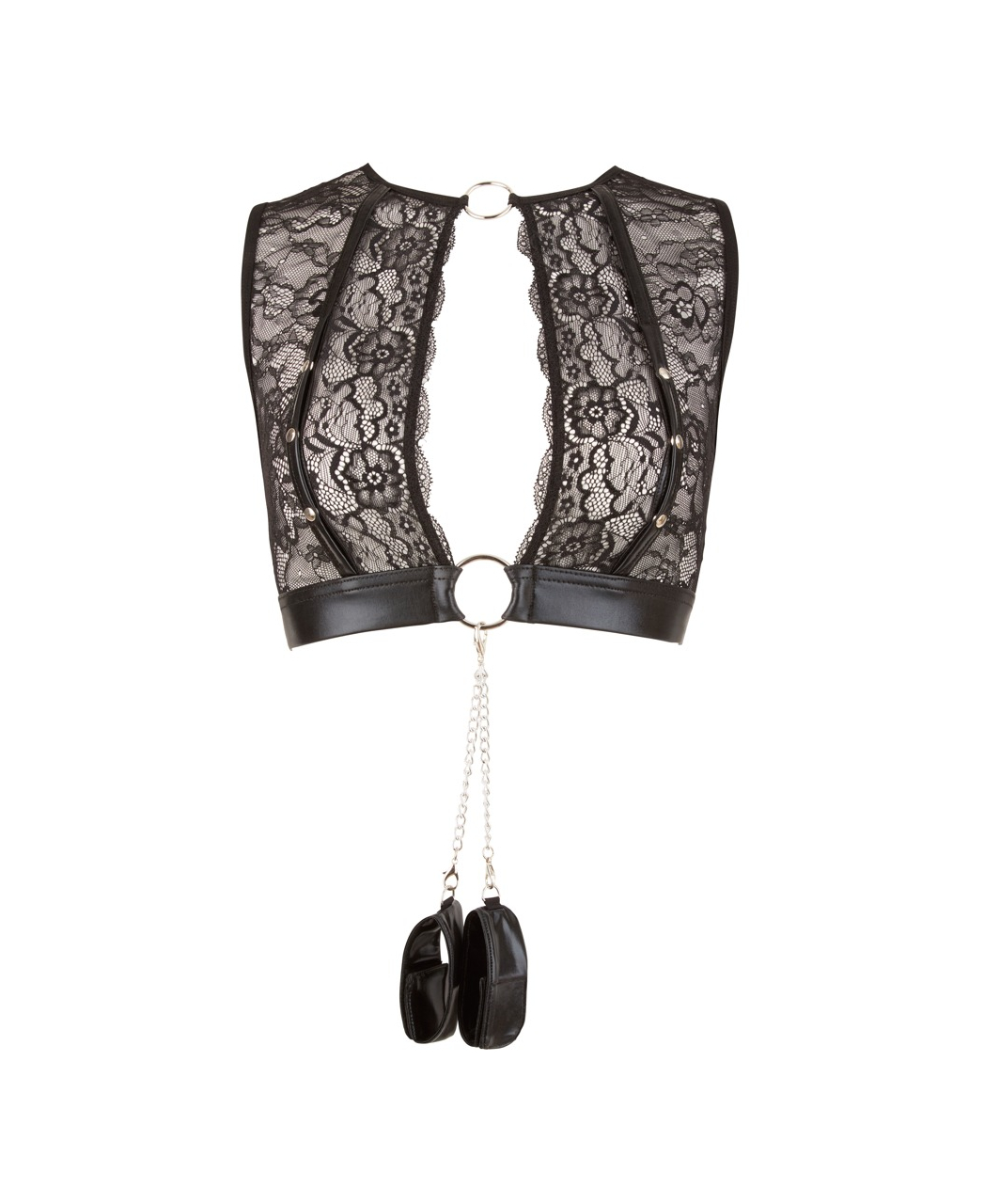 Top and suspender belt made of transparent lace and black wetlook. The highlight: the press studs over the breasts that are extremely easy to undo and the handcuffs with hook and loop fasteners that can be quickly attached to the decorative rings on the top or the suspender belt with the snap hooks. This means that this lingerie set can quickly be turned into a special bondage set for beginners! The top and suspender belt has the adjustable hook fastener. The top has also a small button at the back of the neck. With adjustable suspender straps. Without stockings.