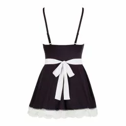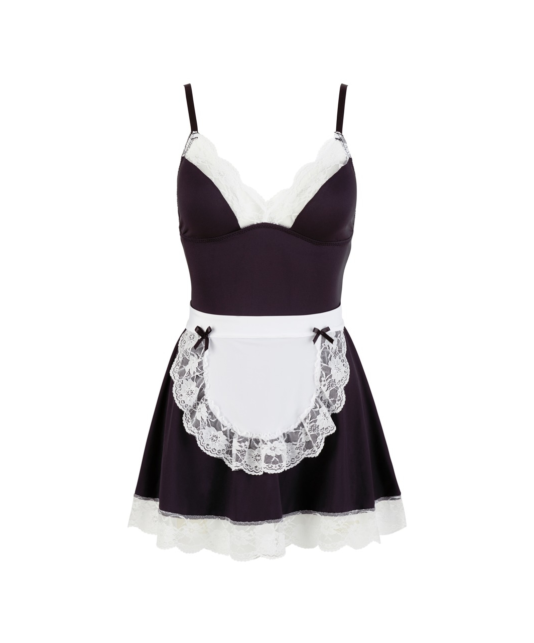Black mini dress with adjustable straps and a slightly flared skirt part. White lace on the hem and in the cleavage area. White apron with lace, decorative bows and ties.