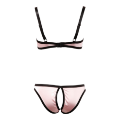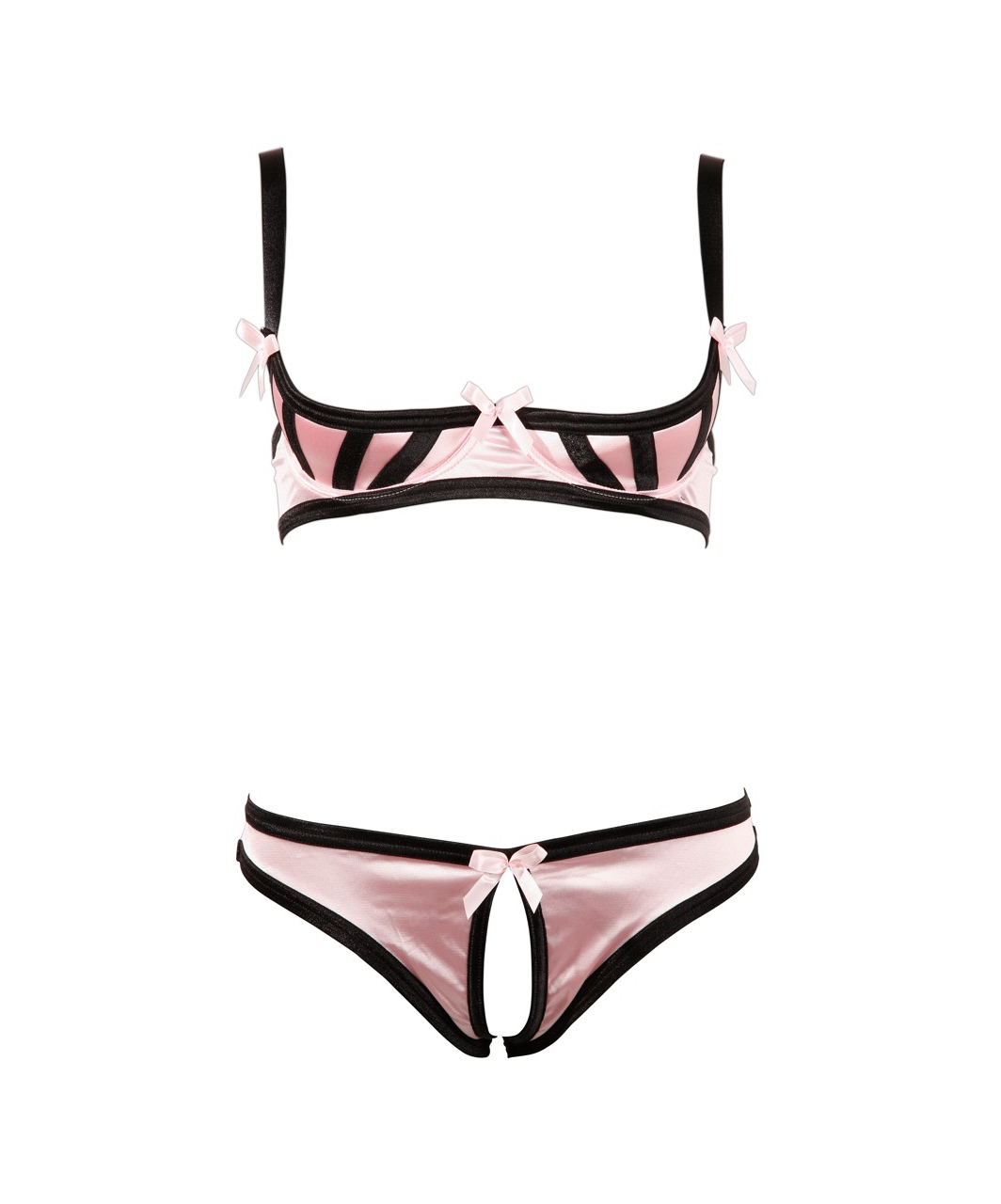 Erotic set made of pink satin with black details and pink bows. Underwire shelf bra with slightly padded cups and adjustable straps. Adjustable closure on the back. Matching crotchless briefs.