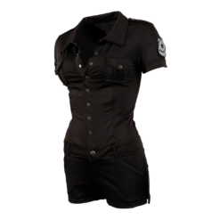 Black jumpsuit with short sleeves and two patch breast pockets. “Special Police” print on the left arm. Press studs front closure.