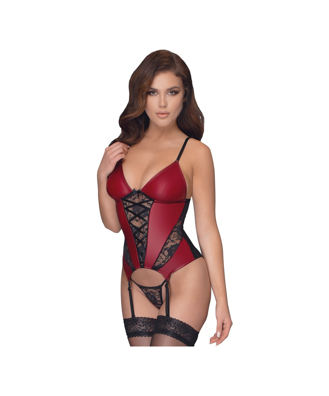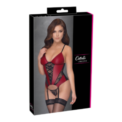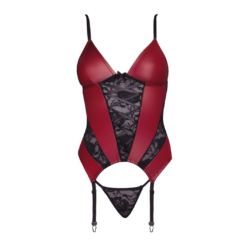 Red basque with black lace inserts at the front and sheer mesh at the back. Straps and garters are adjustable. Matching lacy G-string included. Without stockings.