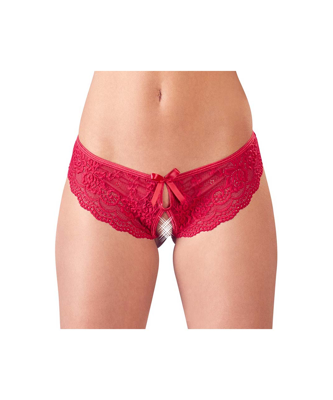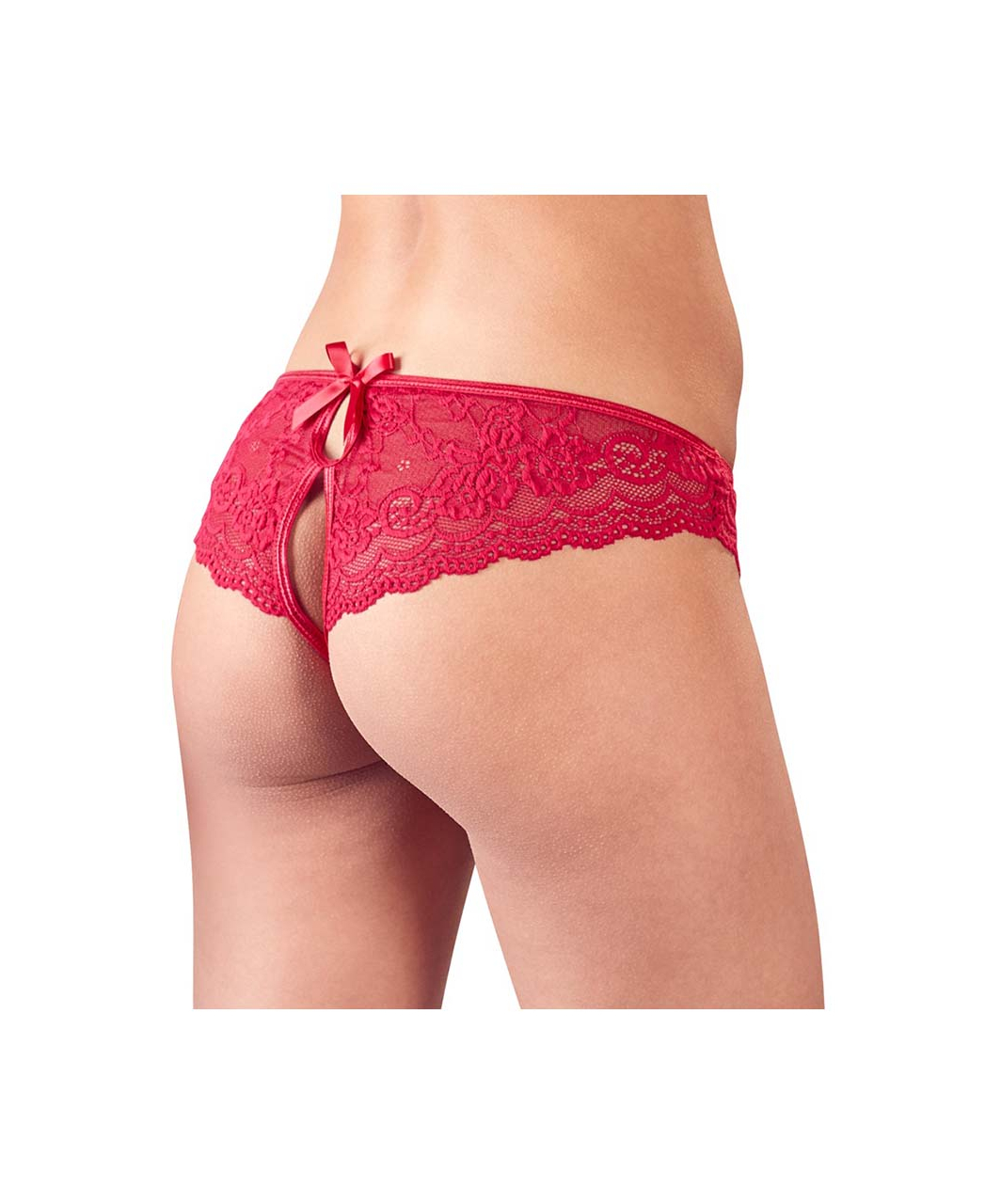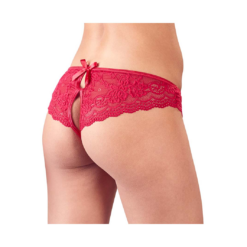 Red floral lace panties with cutouts at the front and the back that are adorned with bows. The crotch is only held together by 2 stretchy straps.