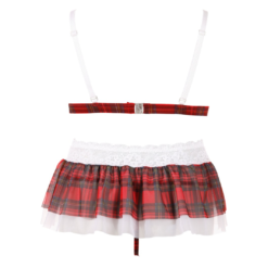 The combination of plaid pattern fabric and white lace makes this combination your sweet mix&match statement. The soft bra has white lace cups, adjustable straps and a clip-closure in the back. The double layer mini skirt with lace top and net lace petticoat and the crotchless g-string are matching this combo and top off the style fully.