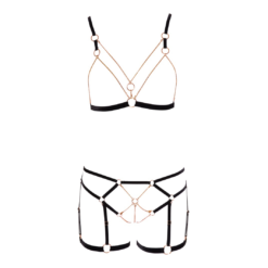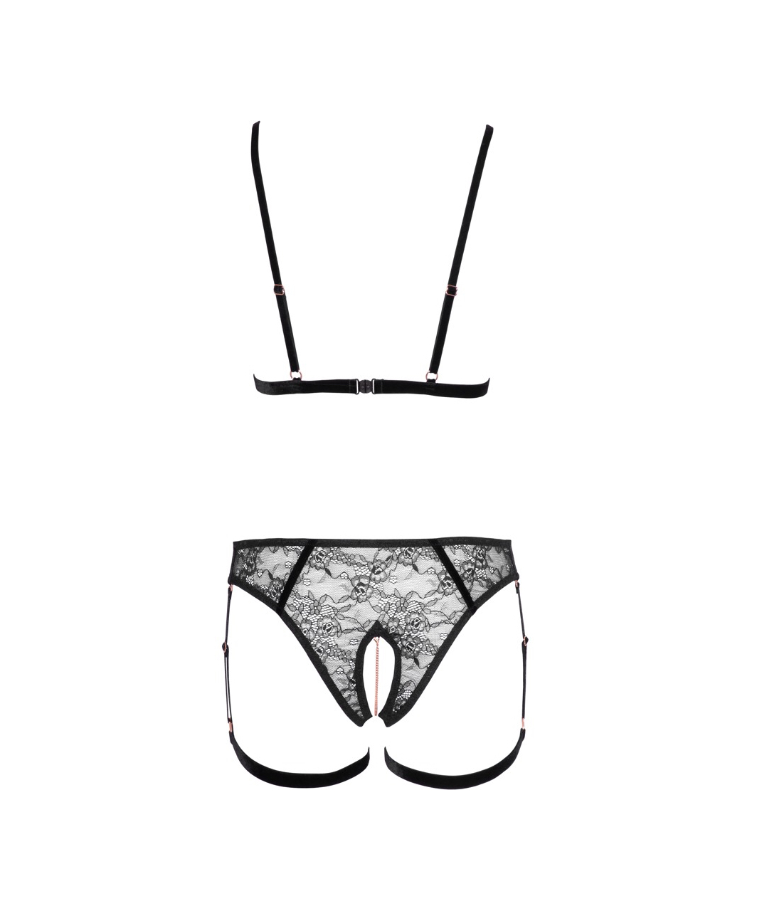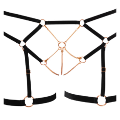 Open cup bra made of black velvet elsatic straps in a set with crotchless and frontless panties. The suspender set adorned with rose gold-coloured metal chains. Shoulder straps and garters are adjustable. Some of the chains and garters are detachable.