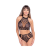 The shelf bra and suspender belt are made out of stretchy satin with lace inserts. The crotchless string is made entirely out of lace. The underwired shelf bra has a rhinestone heart between the slightly padded cups, and a hook fastener at the back. The suspender belt has decorative lacing and a hook fastener at the back. The bra and suspender straps are adjustable. Without stockings.