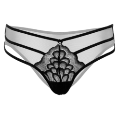 Black thong with sheer mesh back and lace & string front. Adorned with rhinestone heart pendant.