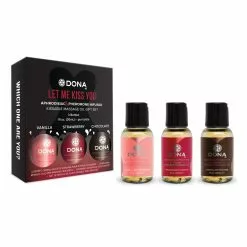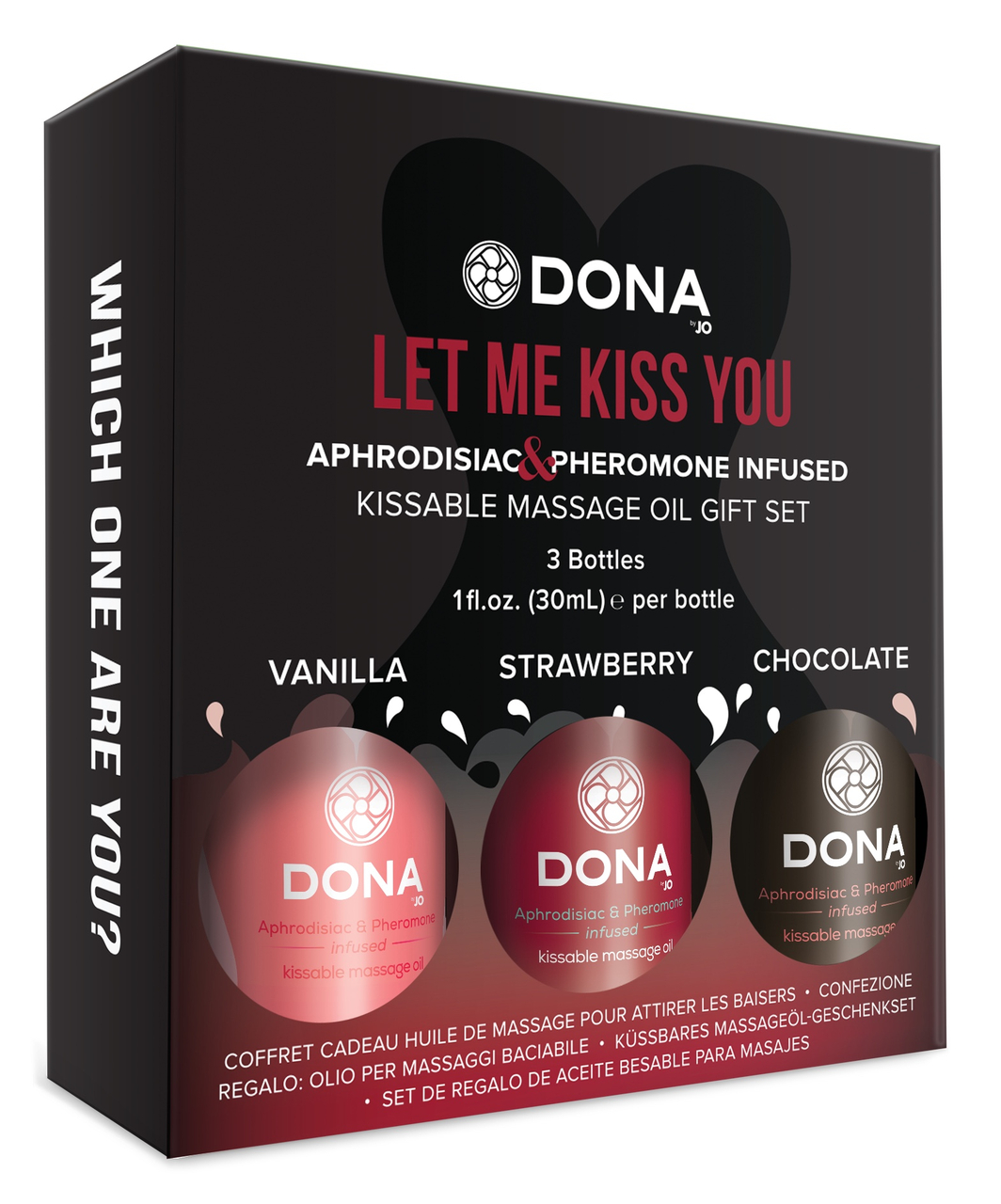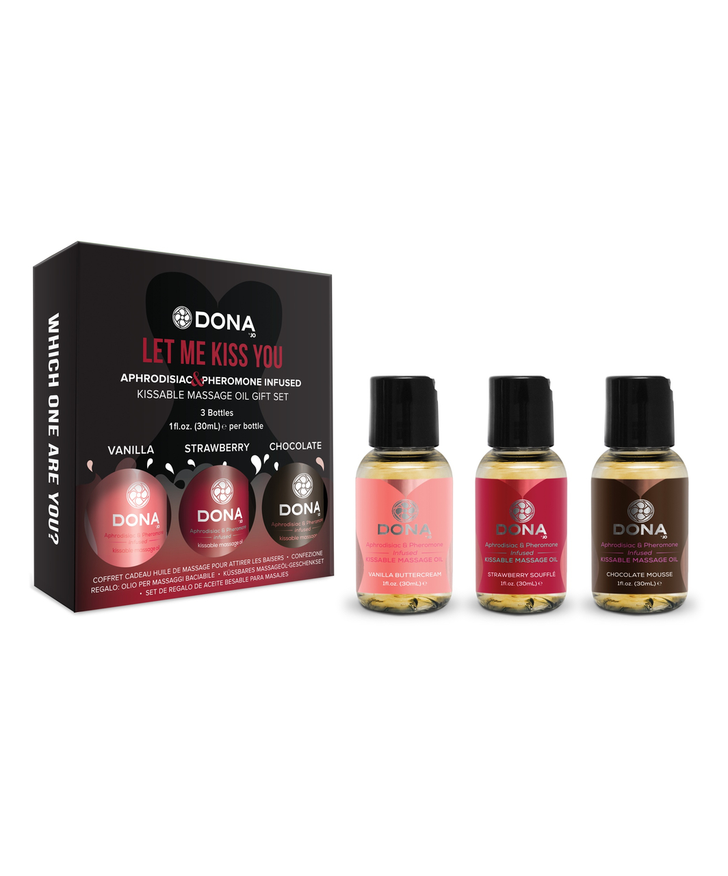 Transform your lover into a sensual dessert with the DONA Kissable Massage Oil Gift Set. In 3 intoxicating flavors, DONA Kissable Massage Oil tempts your taste buds as you kiss away tension while awakening your inner siren with aphrodisiacs & pheromones. Be deliciously desirable and savor your intimacy.