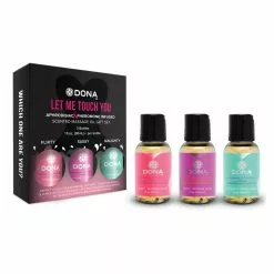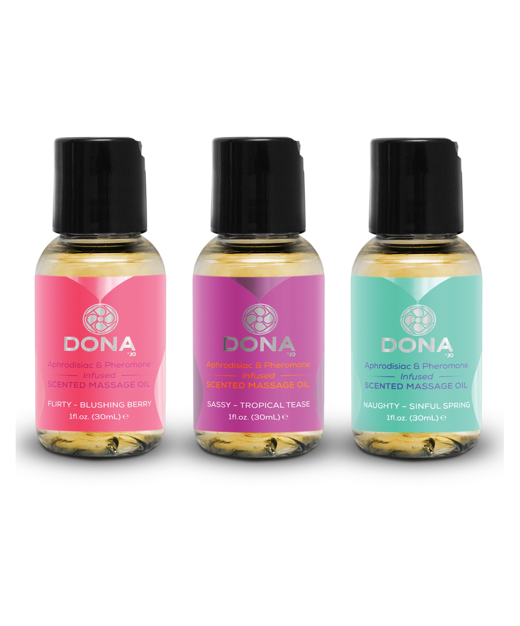 Entrance your lover with the DONA Scented Massage Oil Gift Set. In 3 indulgent fragrances to suit all your moods, DONA Scented Massage Oil is infused with aphrodisiacs and pheromones to ignite your desire for one another while relaxing away tension. Be irresistible to the touch as you melt into aromatic bliss.