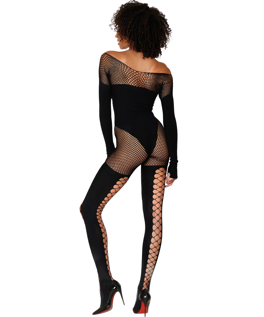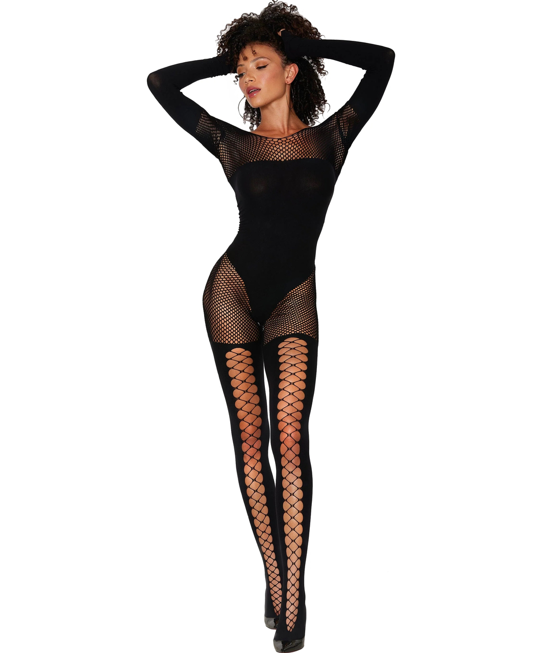 Black seamless bodystocking with long sleeves, designed in opaque teddy & mock lace-up stocking style. Unisize (S–L).