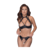 Zebra striped black net strappy bodystocking set – mock turtle neck crop top with long sleeves in glove style, completed with matching footless leggings. Both garments features metal rings and elastic straps. Unisize (S–L).