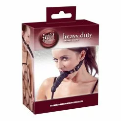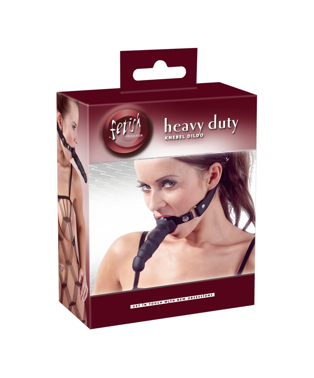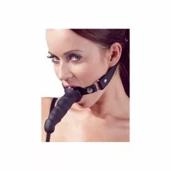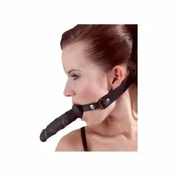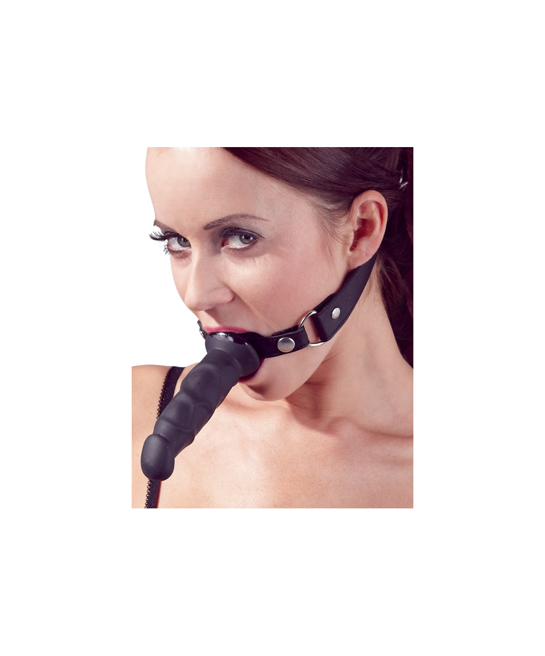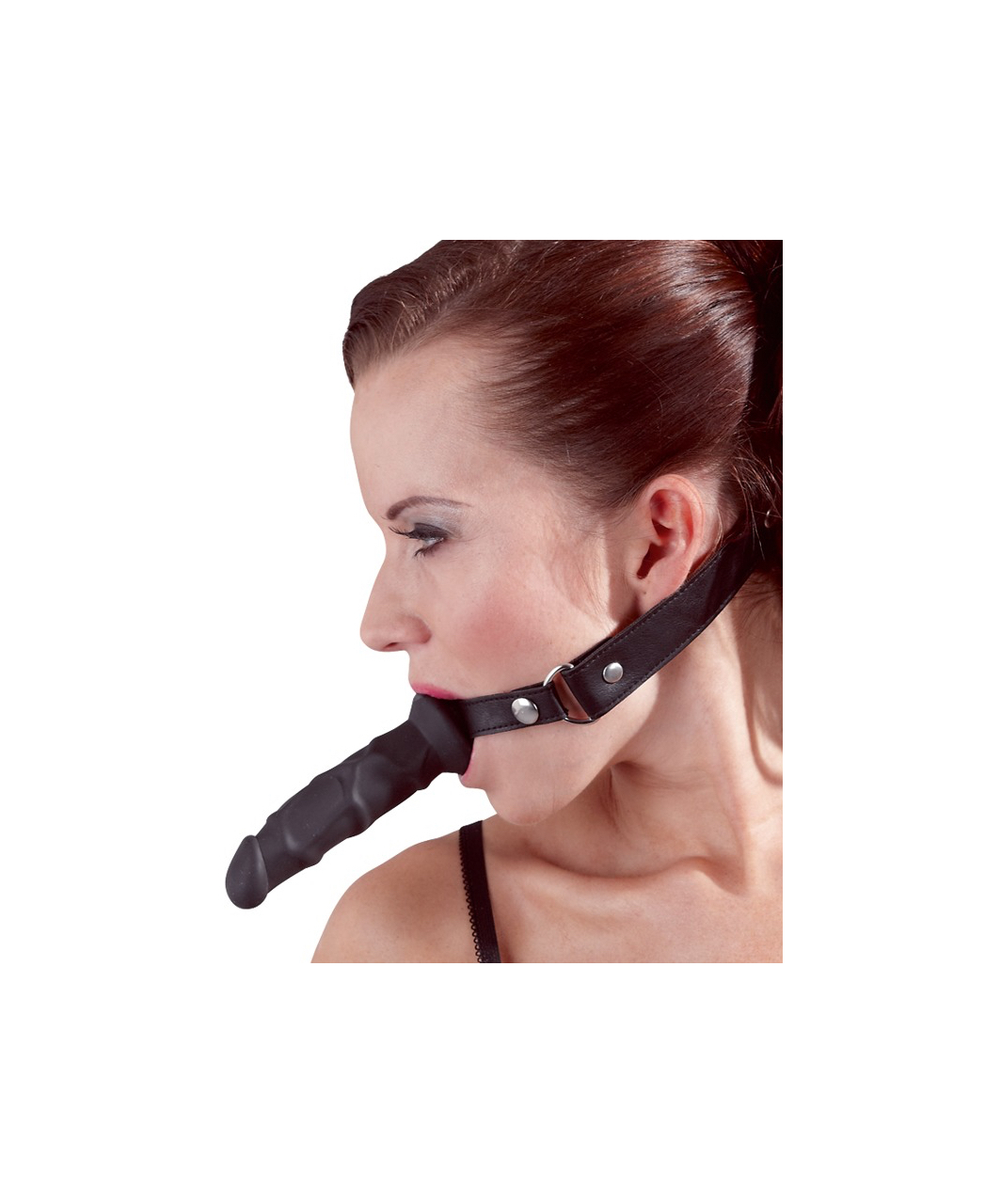 Half-ball mouth gag with dildo (12 cm, 3 cm diameter) on synthetic leather string. Adjustable size with buckle-closure. Black. Material: polyurethane, silicone (dildo), free of phthalates according to EU regulation REACH.