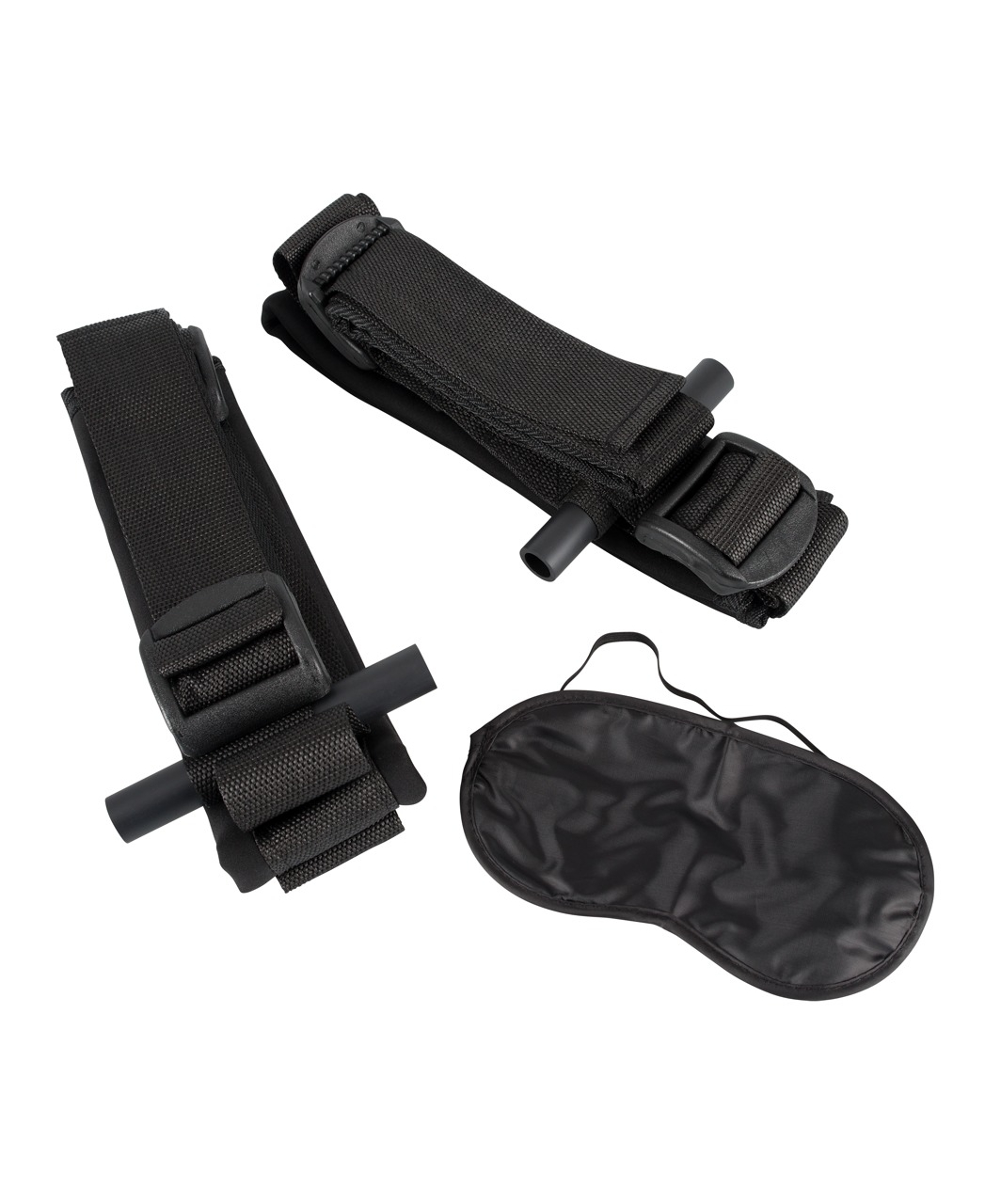 Love swing to attach onto the door. Two black, multi-adjustable belts with loops for arms and legs. On two acrylic rods for attachment. Max. weight 120 kg. Material: polyester. Satin eye mask included.
