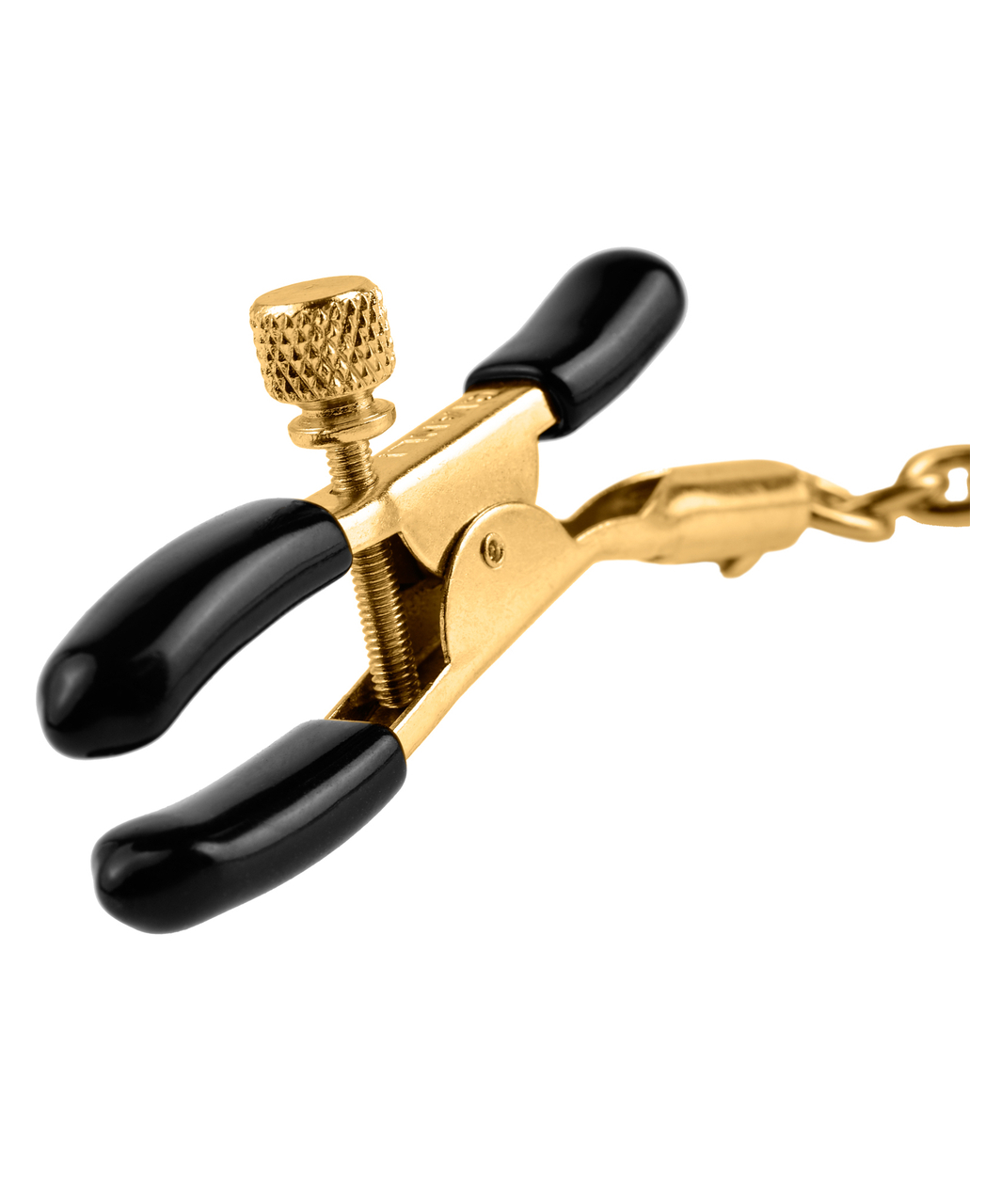Gold-coloured nipple clamps with lightweight chain and vinyl liners.