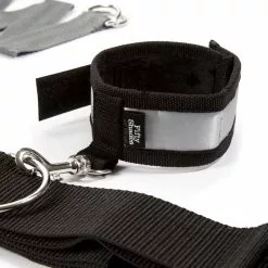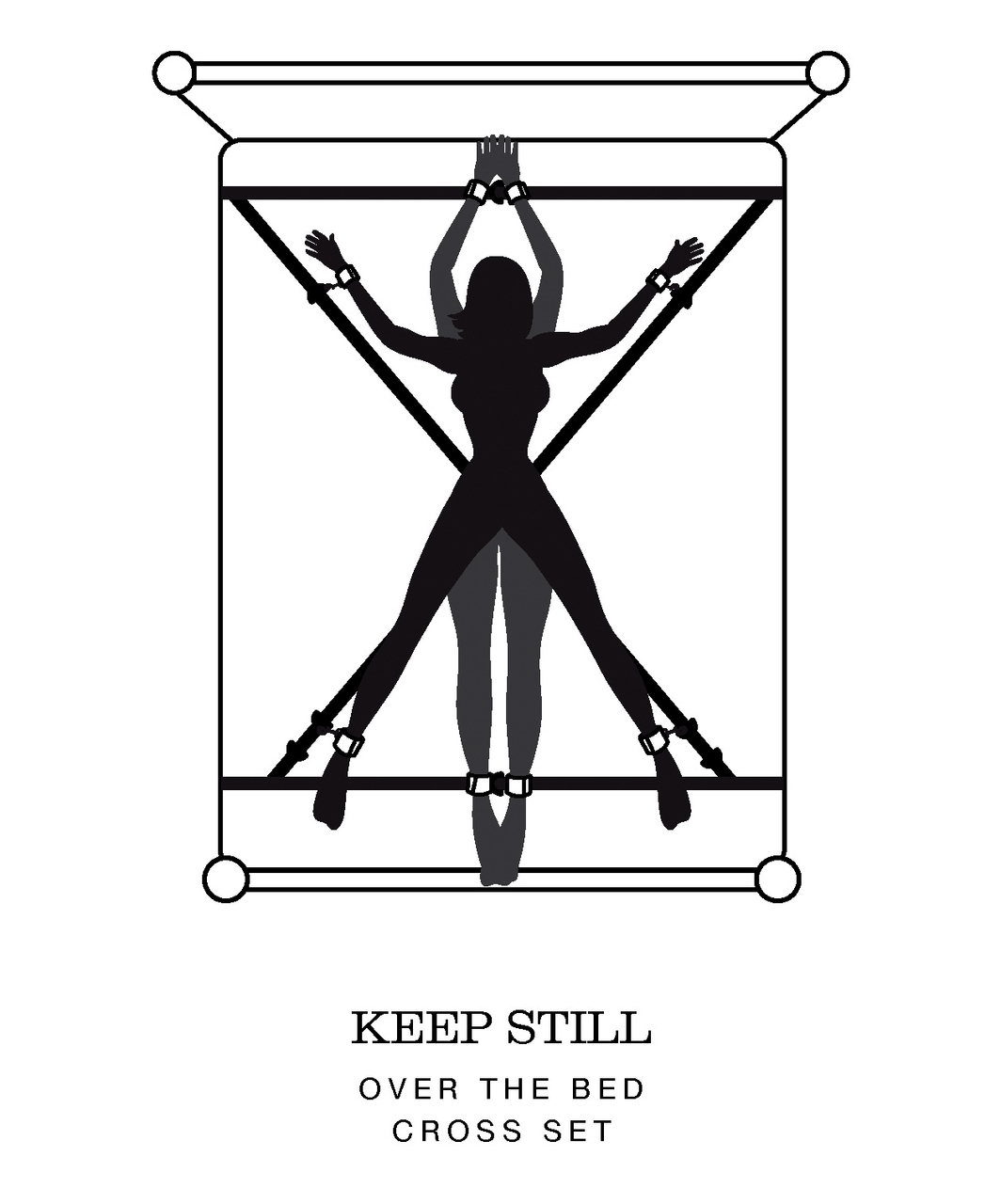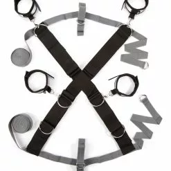 Explore new styles of bondage play with this over the bed cross restraint, which allows ankle and wrist cuffs to be positioned both vertically and horizontally. A deluxe new spin on a classic restraint system, inspired by the Fifty Shades of Grey books. Unguarded vulnerability or spread-eagled exposure? The choice is the dominant’s, as they arrange the cuffs for maximum excitement. Double up the fun once more by securing the submissive on their front – the versatile restraint allows for a wide variety of positions. The quality wrist and ankle cuffs feature a soft satin exterior, with the inside lined with faux fur for a truly comfortable experience. Fastened by secure, adjustable Velcro, the cuffs are simple for a partner to secure and remove, yet provide a highly effective restraint tool for the wearer. The restraint is easy to set up and requires no tools for assembly, just a double bed of any size. Place the black straps in a diagonal cross on top of your mattress with the wrist and ankle cuffs at each corner. Feed the thin grey straps around the head and foot of your mattress, taking care to ensure the 2 D-rings remain on top. Feed the straps through the D-rings and tighten.