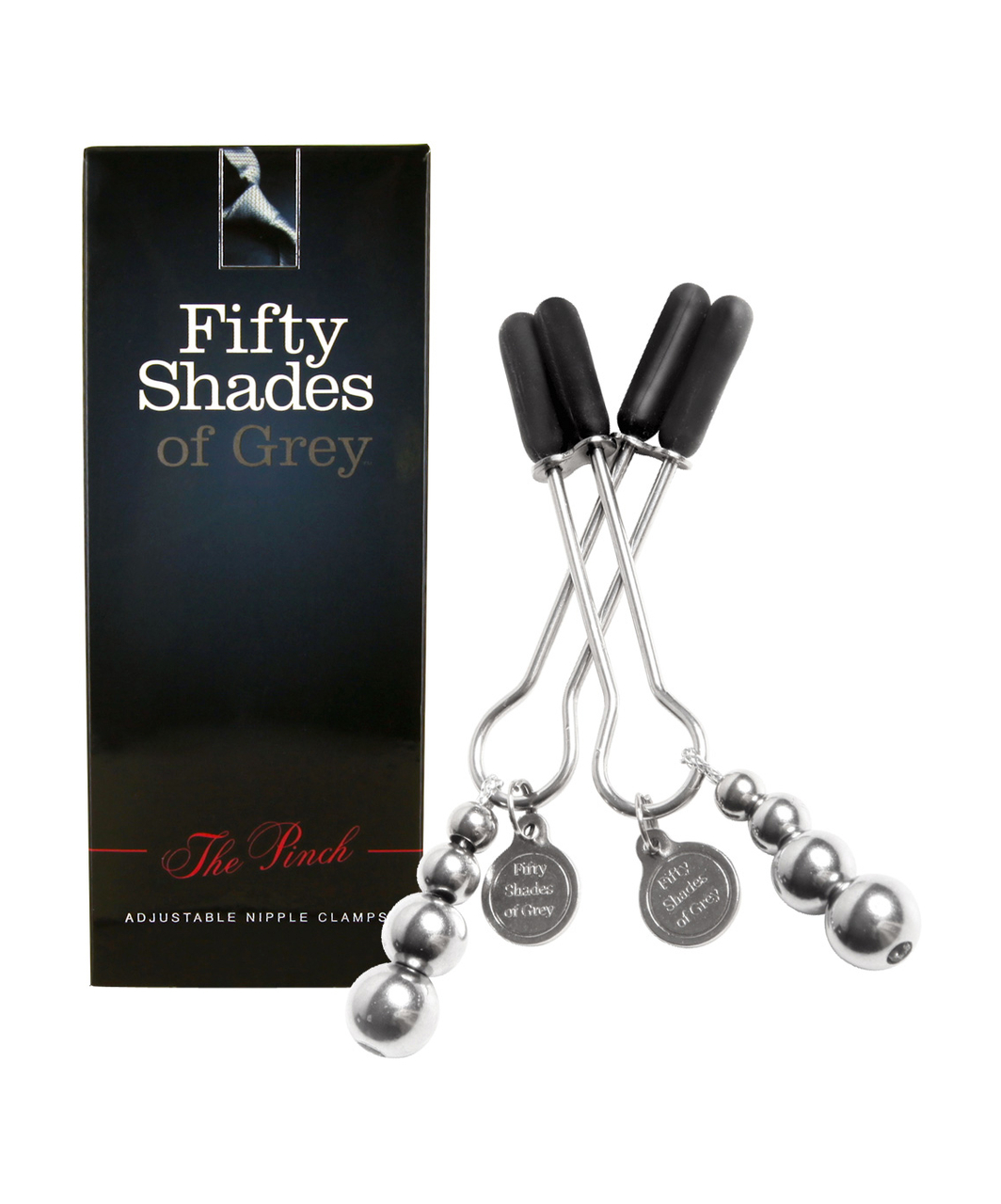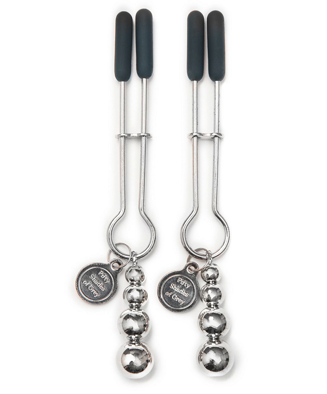 Taken from the official Fifty Shades of Grey Collection: nipple clamps with a 9 grams graduating balls weight. You can adjust the pressure intensity. Material: metal.