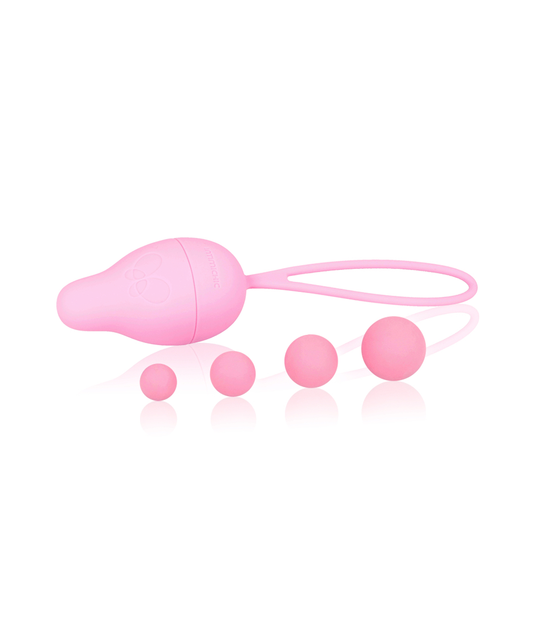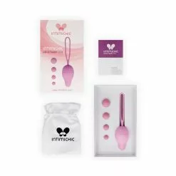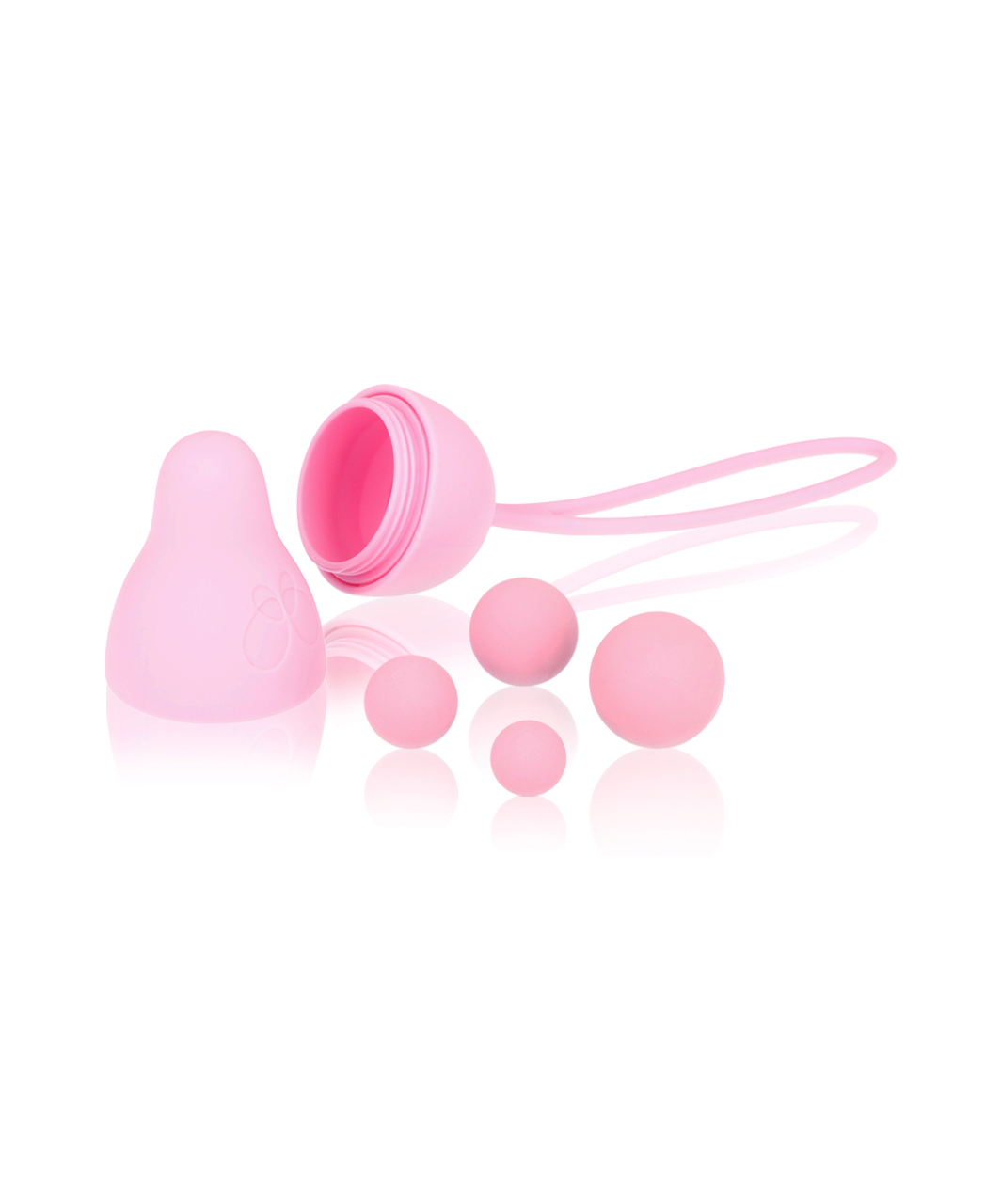 Light pink set consisting of a vaginal cone and 4 balls of different sizes and weights, as well as a cloth bag for storing the cone. The vaginal cone is two-part, screwable, with a satin smooth silicone coating and a flexible 9 cm long grip loop that will help to remove the cone easily. The set is designed to strengthen the pelvic floor muscles by performing regular exercises to improve intimate health, maintain the tone of the pelvic floor muscles and vaginal walls. Place the balls in the cone one at a time, starting with the lightest, and gradually increase the weight of the cone from 32 to 59 grams, thus allowing the ball to roll freely inside, creating enjoyable vibrations during movement. It is possible to increase the weight of the cone even more (64 – 77 g) by placing two balls at once, but note that you can perform exercises with a higher weight only when you are sure of the achieved result. For better glide and a more pleasant feeling, the training cone should be used with water-based lubricants, as they do not damage the soft material of the cone. After use, wash in warm water with neutral soap or with special sex toy cleaners.