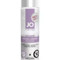 JO for Her Agapé (pronounced ah-gah-pay) is a personal water-based lubricant designed to mimic a woman’s natural lubrication. This new and improved formula is free of glycerin, propylene glycol and parabens. It’s great for daily use, provides sensual enhancement and moisture during intercourse and is 100% latex safe.