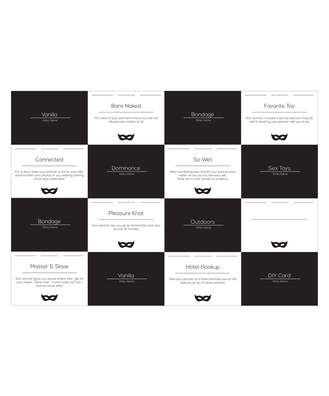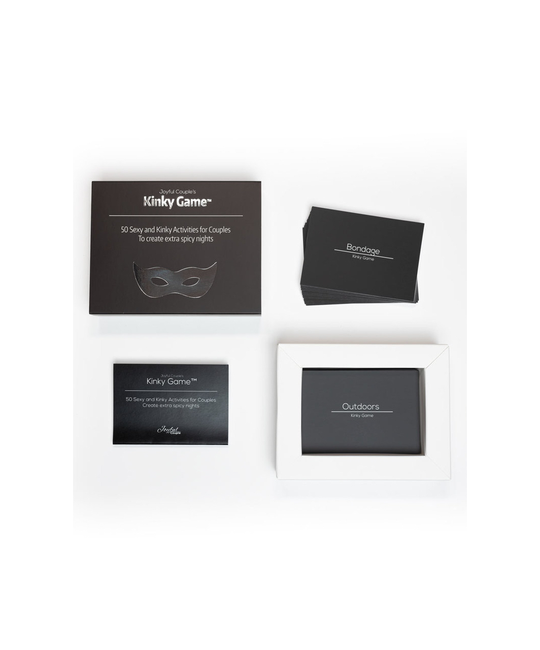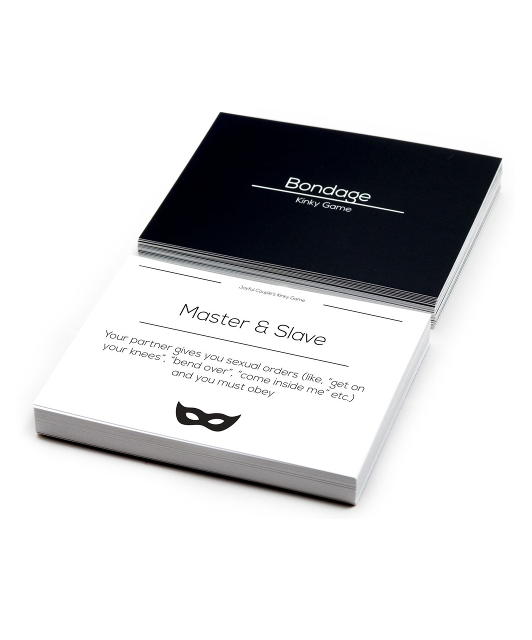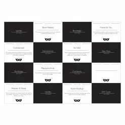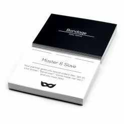 – 50 High quality playing cards that includes activities from romantic to kinky:10 Vanilla Cards, 10 Outdoors Cards, 10 Sex Toys Cards, 10 Bondage Cards, 10 Dominance Cards