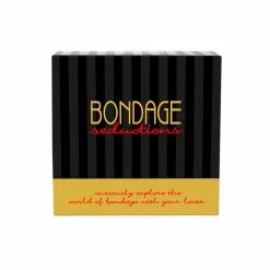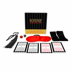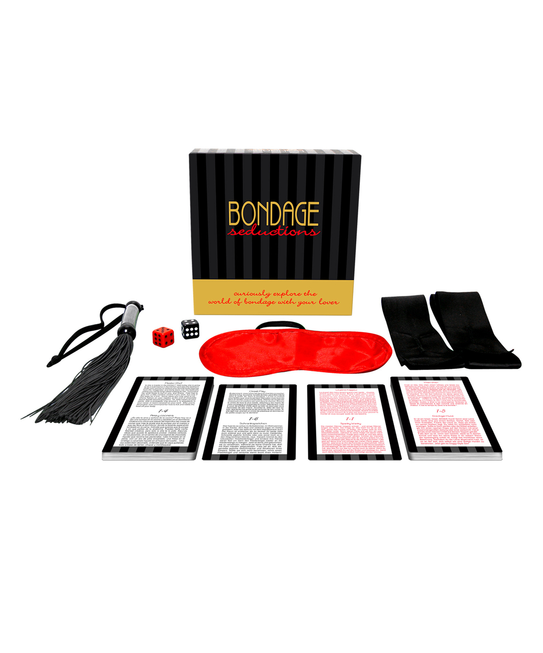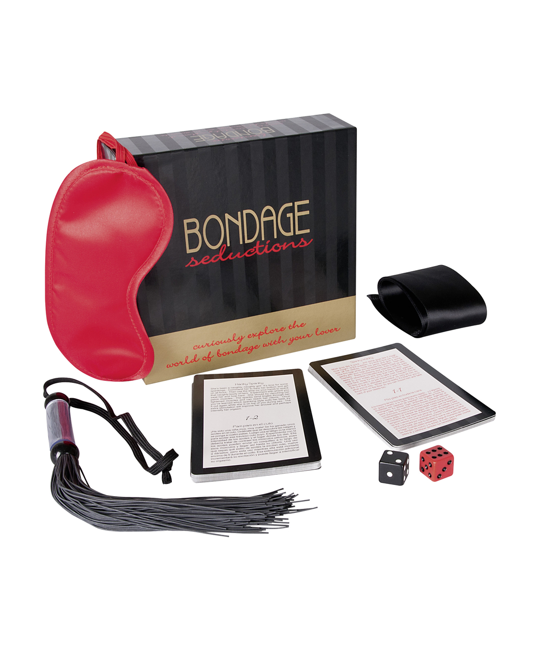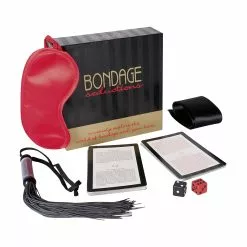Bondage game. Content: 36 bondage seduction cards, 2 silk ties, 2 dice, 1 blindfold, 1 rubber whip, playing instructions. Multilingual edition: DE, EN, ES, FR.