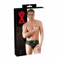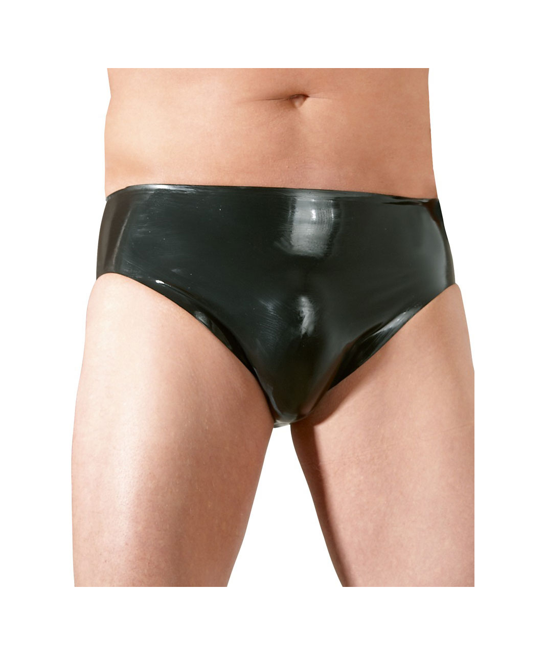 Black latex briefs for men with integrated penis-shaped anal plug.