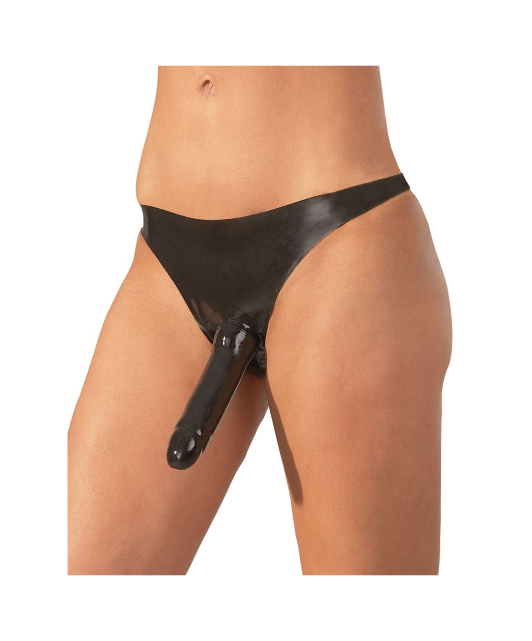 Simple black latex briefs with a sturdy natural looking dildo on the outside.