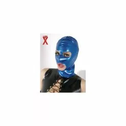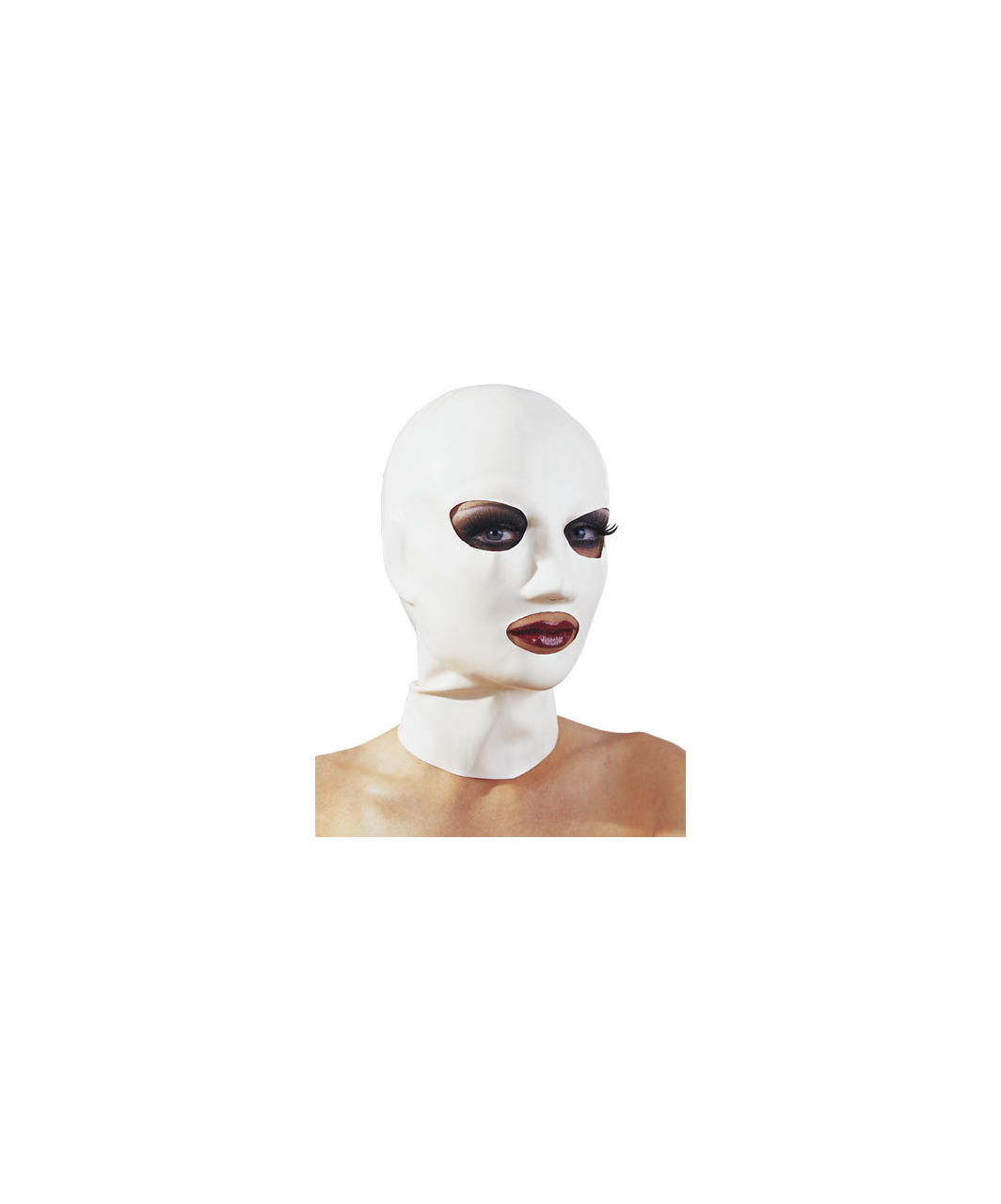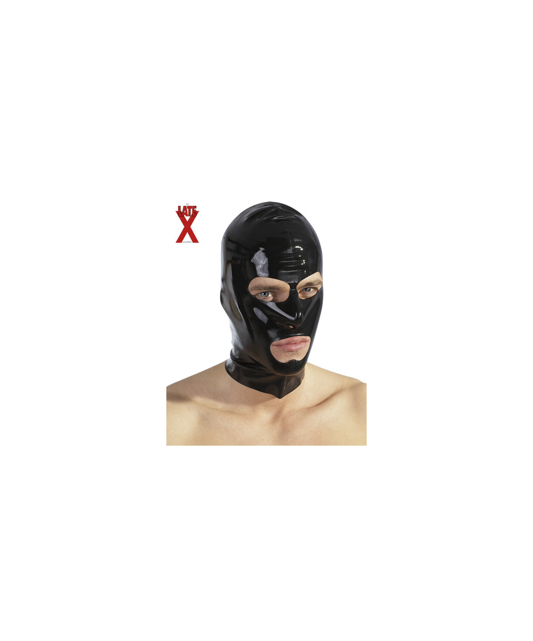 Black latex hood with openings for eyes, mouth, nostrils. Flatly immersed.