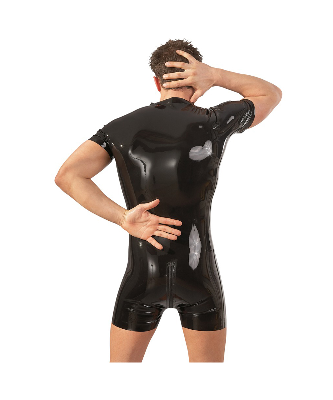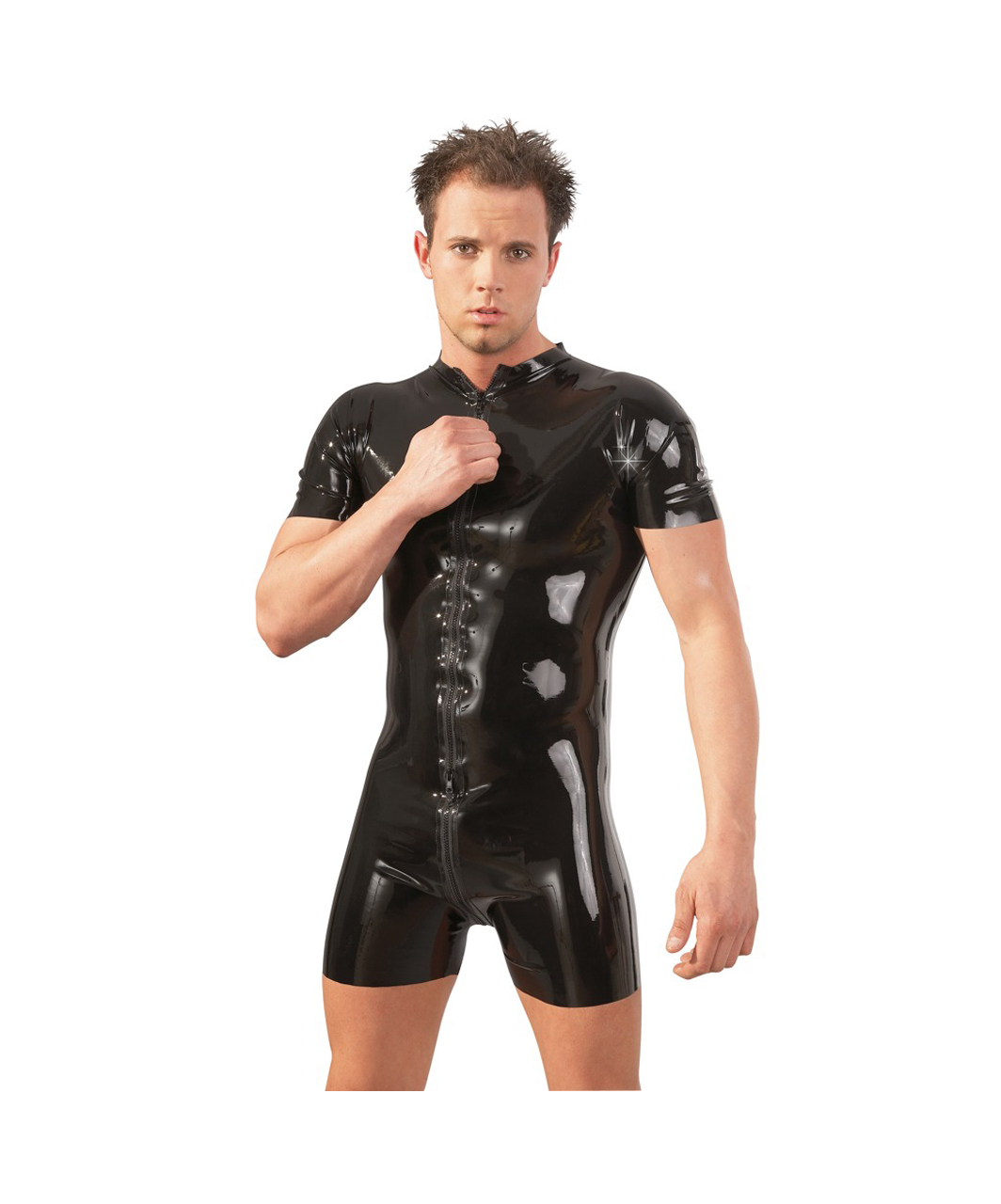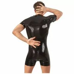 Latex overall. Chiefly, black one-piece suit with 2 way zipper from neck to bottom.