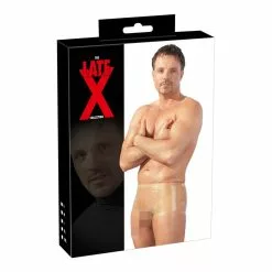 Anatomically shaped, hard penis/testicle sleeve, very elastic 13 cm. Transparent. 100% latex.