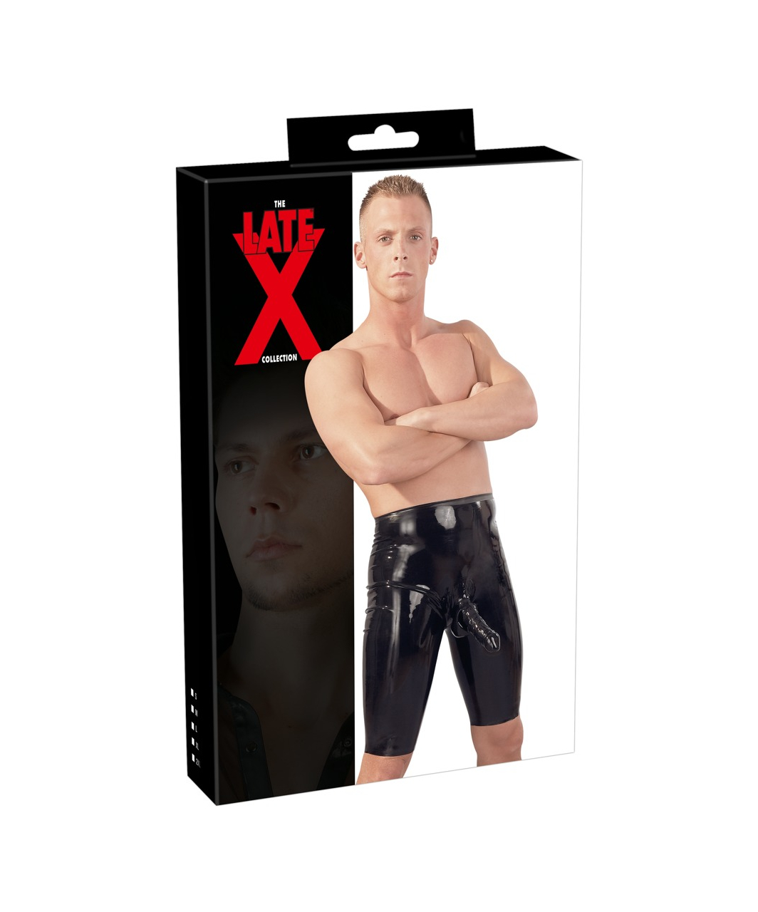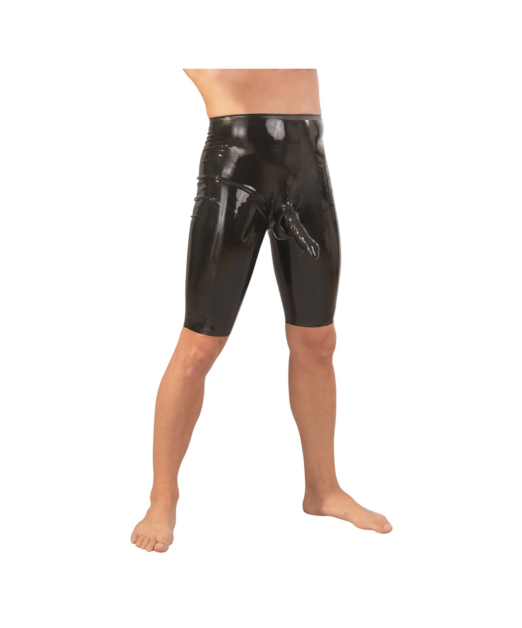Black latex cycling shorts with an anatomically shaped penis/testicle sleeve. There are pronounced veins on the penis sleeve. Flat dipped. 100% latex.