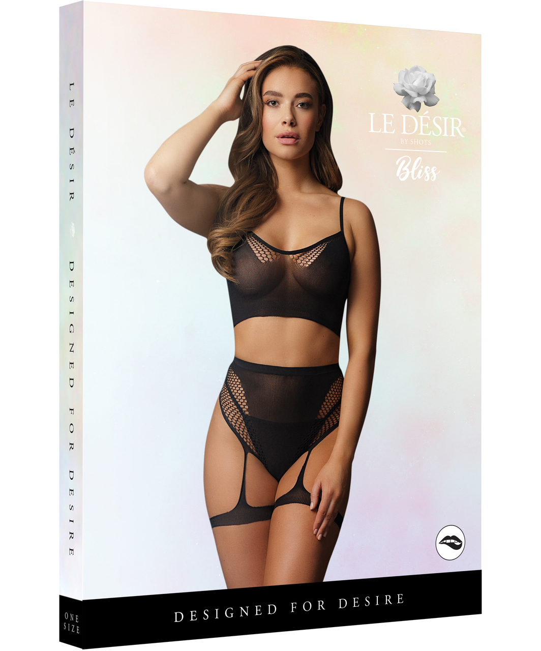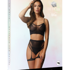 Bralette and high waist suspender briefs made of black stretchy net. Unisize (S–L).