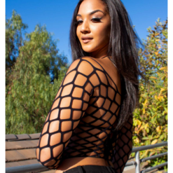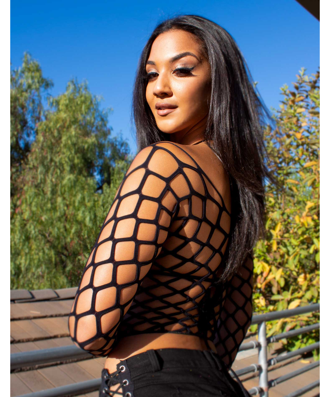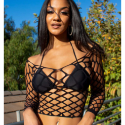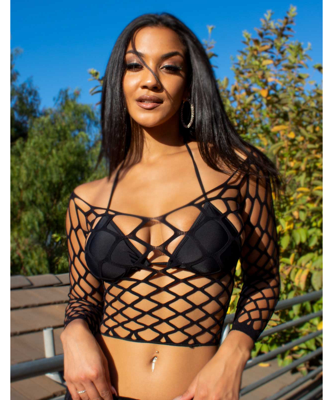 Black wide net crop top with boat neck and long sleeves. Unisize (S–L). Bra not included.