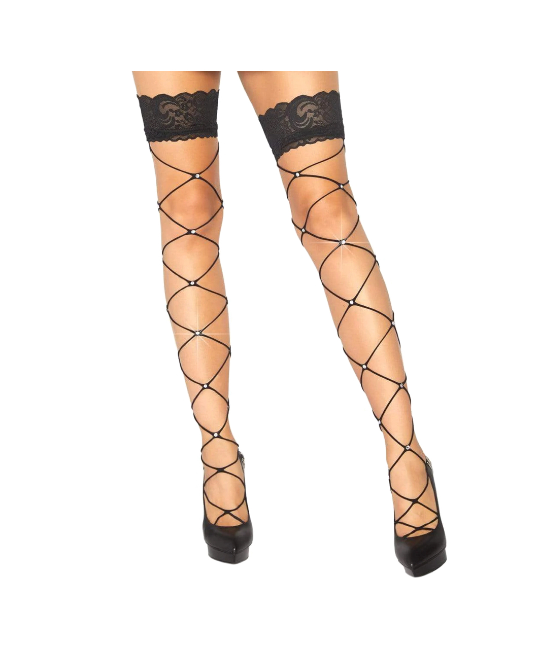 Black extra wide net hold-up stockings with rhinestones and lacy welt. These stockings have a silicone strip inside. Unisize (S–L).