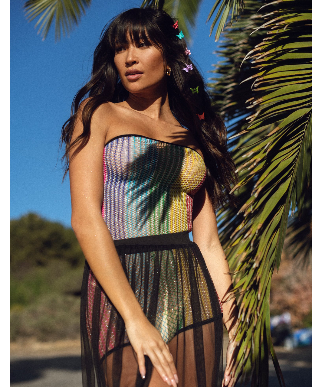 Shimmering net bodysuit with vertical rainbow stripes. Unisize (S–L).