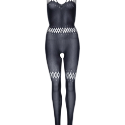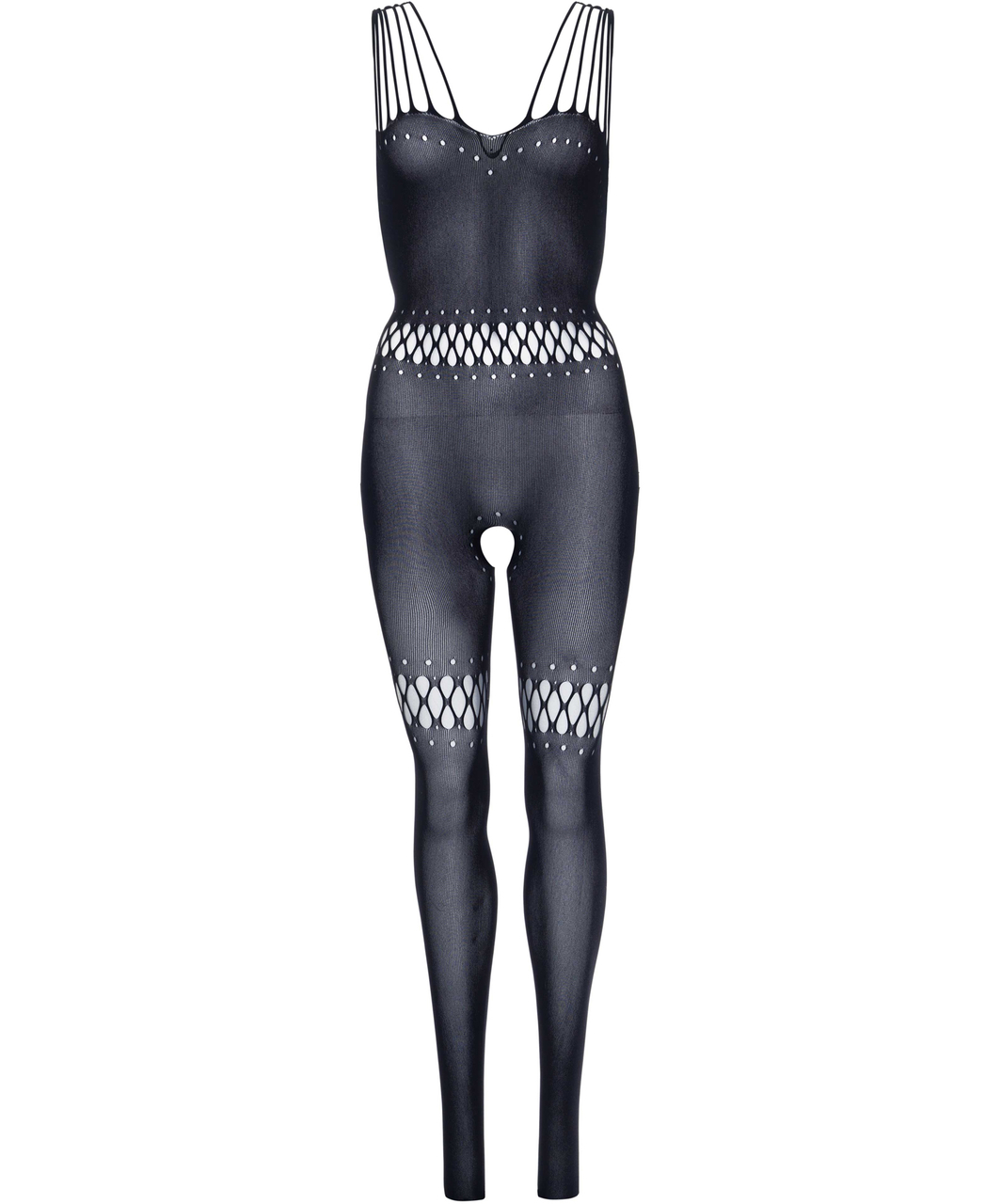 Black net crotchless bodystocking with strappy twist halter and open back. Unisize (S–L).