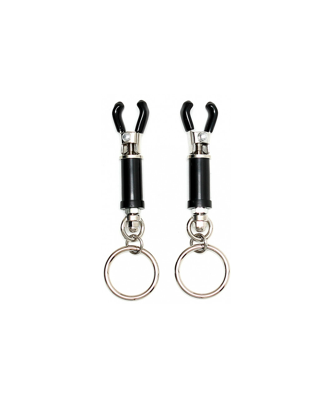 Black, metal nipple clamps with rubber cover. Clamps are adjustable.