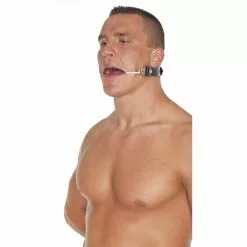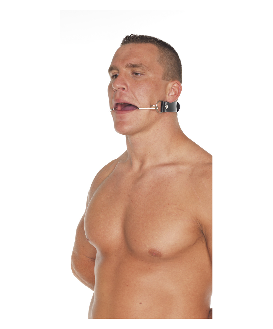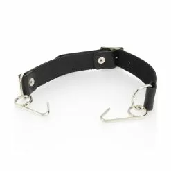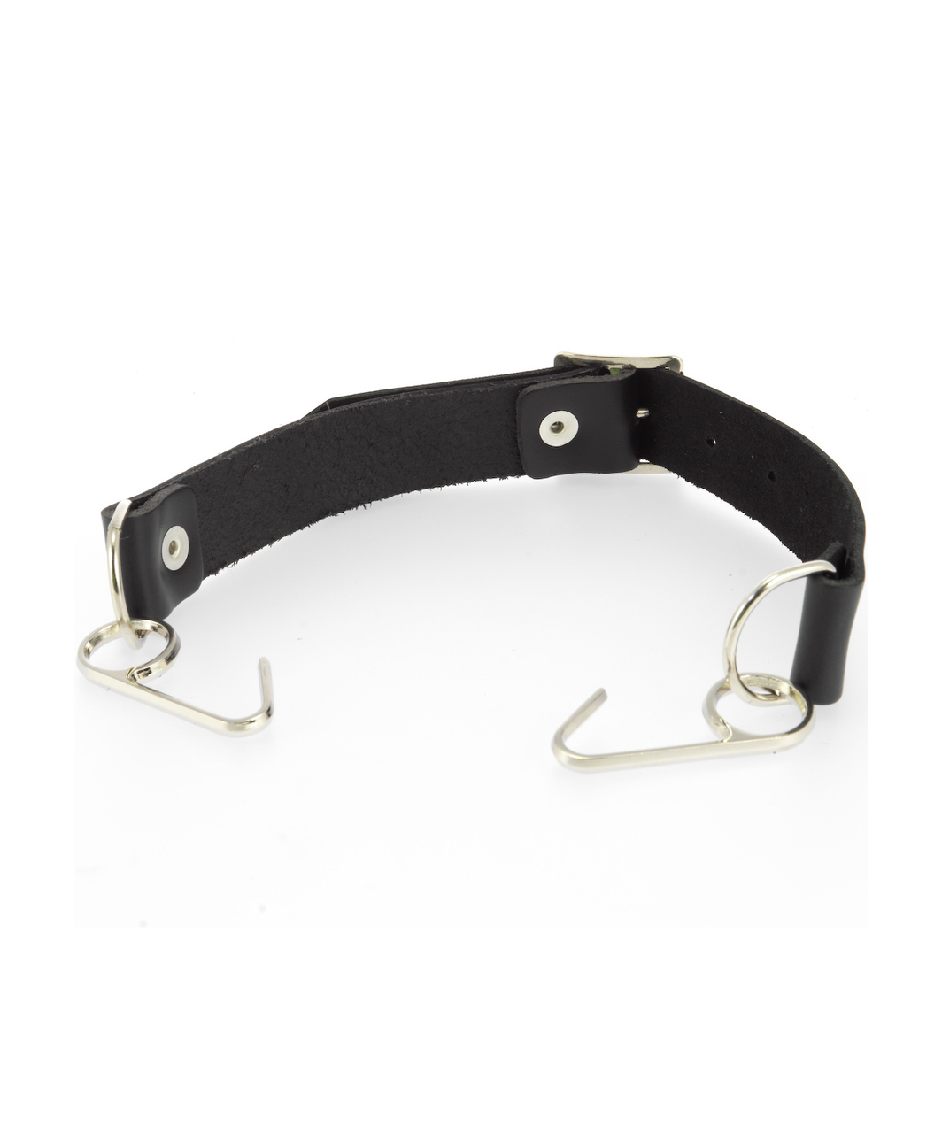 A special BDSM gag playtool with silver hooks for mouth spreading and with black leather straps. The straps ar easily adjustable at the back of the head with a buckle.