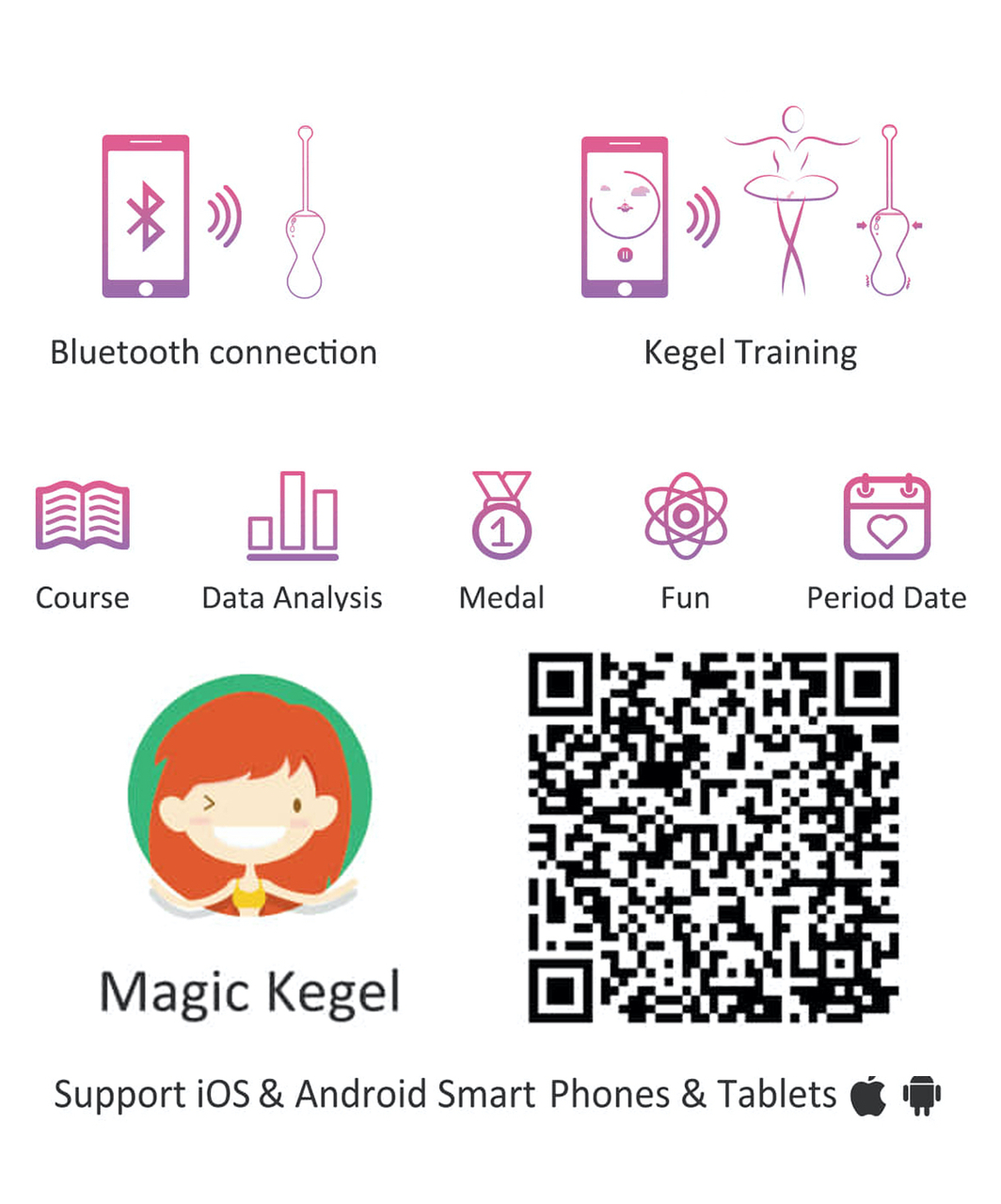 Smart pelvic floor muscle trainer. Including workout guide, personalized virtual coach, six professional training courses, badges, rewards, games and a training system.