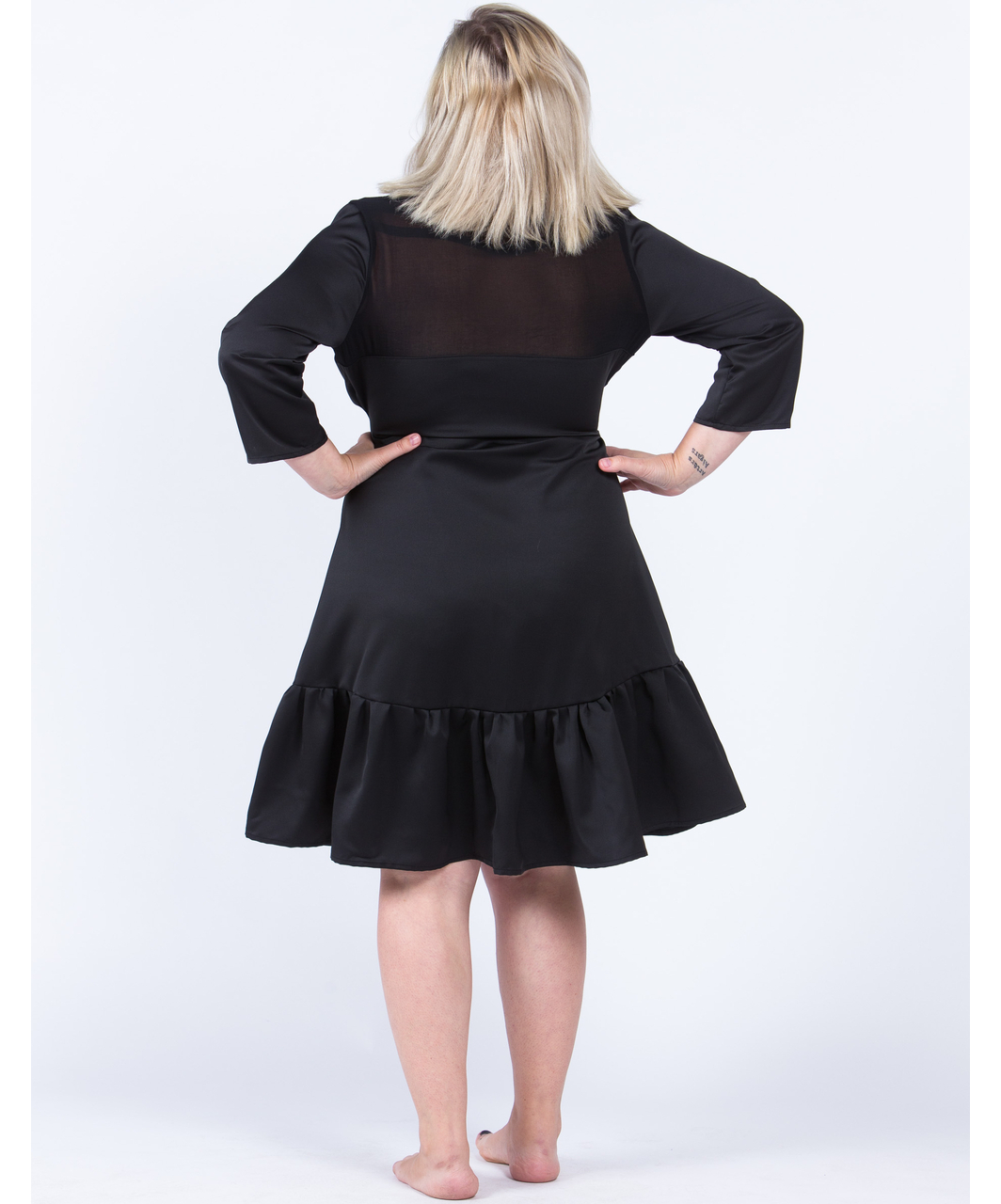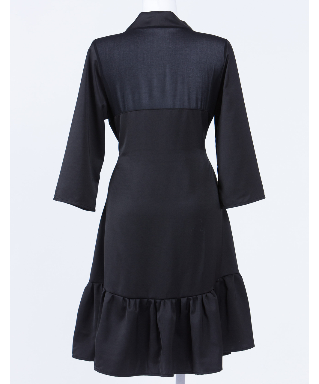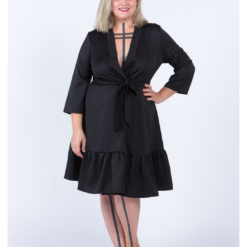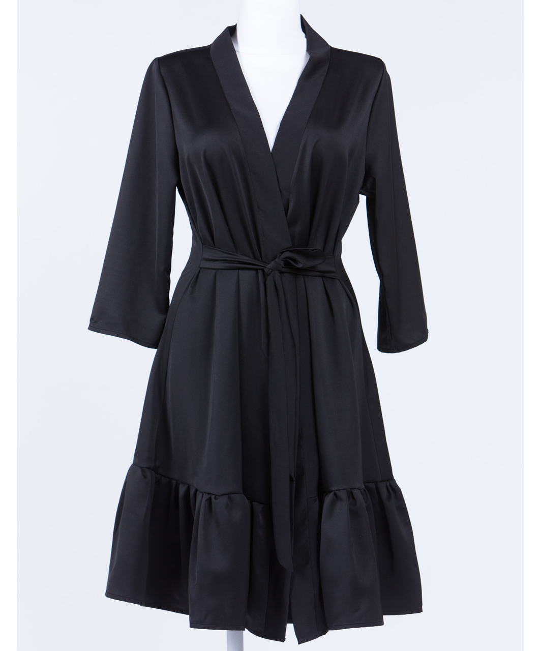 Black satin robe with flounce hem and sash. Made in Latvia.
